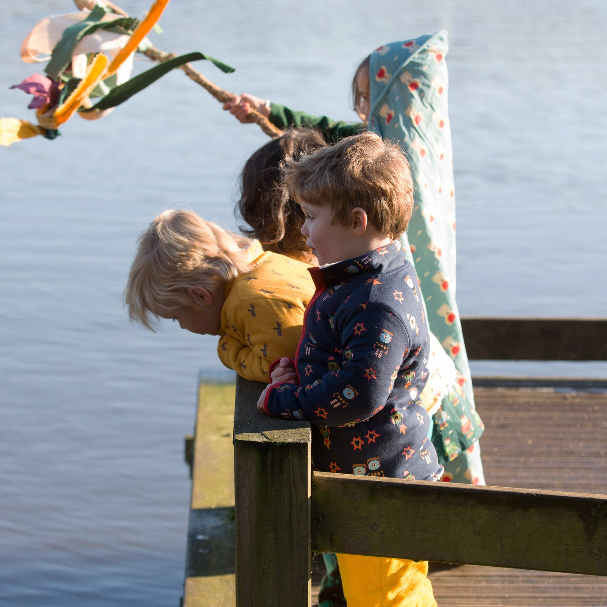 A lovely and cosy jacket to keep little ones warm when they're out adventuring on cold and windy days. It's reversible, and comes with snuggly organic sherpa fleece on one side and a colourful print on the other!
