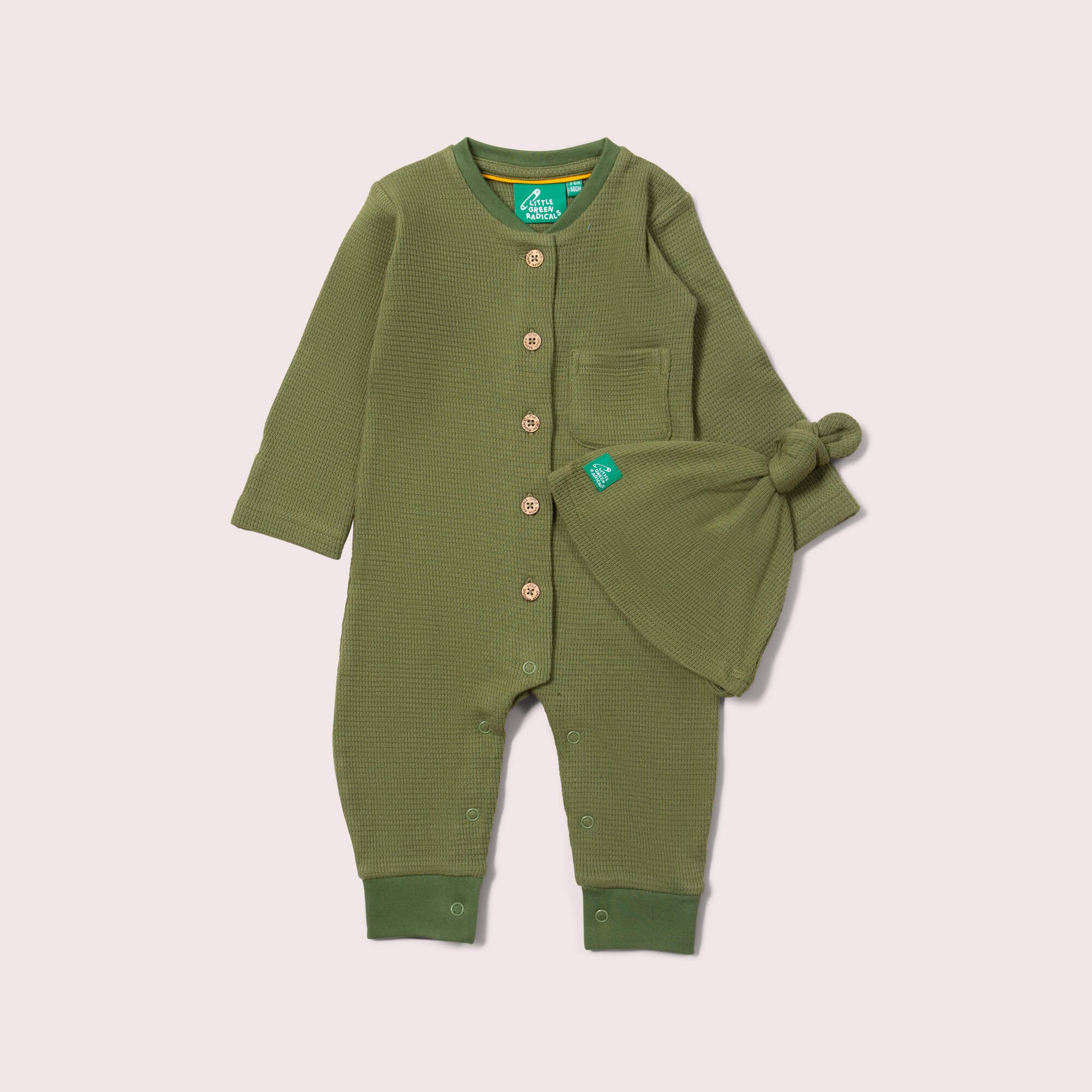 Made from a cosy organic waffle fabric that's kind on even the most delicate skin, our playsuits are designed to make dressing and changing your little one as easy as possible. The come with a comfy ribbed neck, nickel-free poppers and integrated fold-over mitts. This plain colour, luxuriously soft style pairs perfectly with our knitted accessories and baby comforters to make a beautiful welcome to the world gift for newborn babies.
