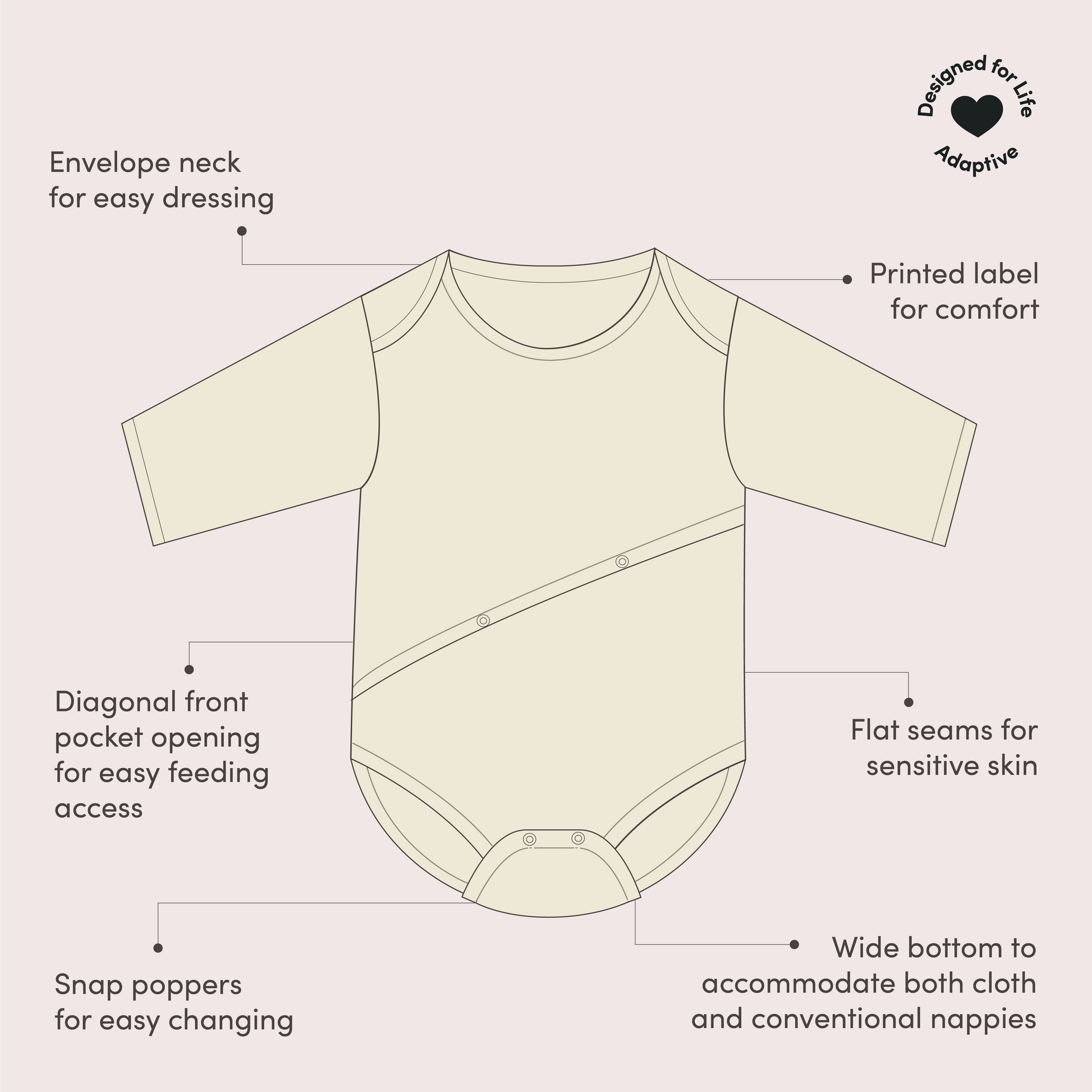 - Nickel-free snap poppers for easy nappy or clothing changes