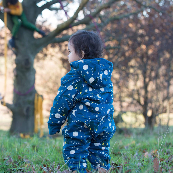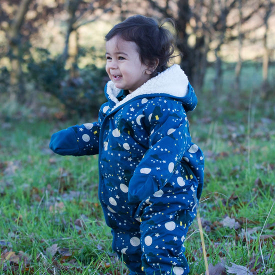 Our snuggly Snowsuits are made using a beautifully soft, breathable organic cotton sherpa lining on one side and a patterned, durable poplin layer on the outside. This is an outerwear piece that can be worn over clothes as a Pramsuit or as an all-in-one for toddlers on the go.