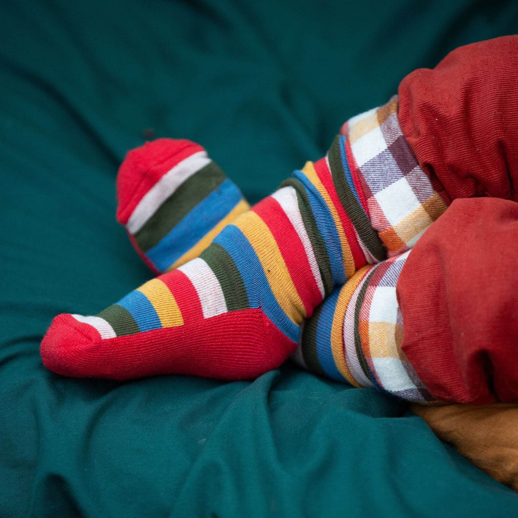 Small feet. Big adventures! Extra cosy, colourful and comfy socks made with organic cotton. This styles comes with a longer length and a super snug terry knit so they're perfect for pairing with our Fair Rubber rain boots.