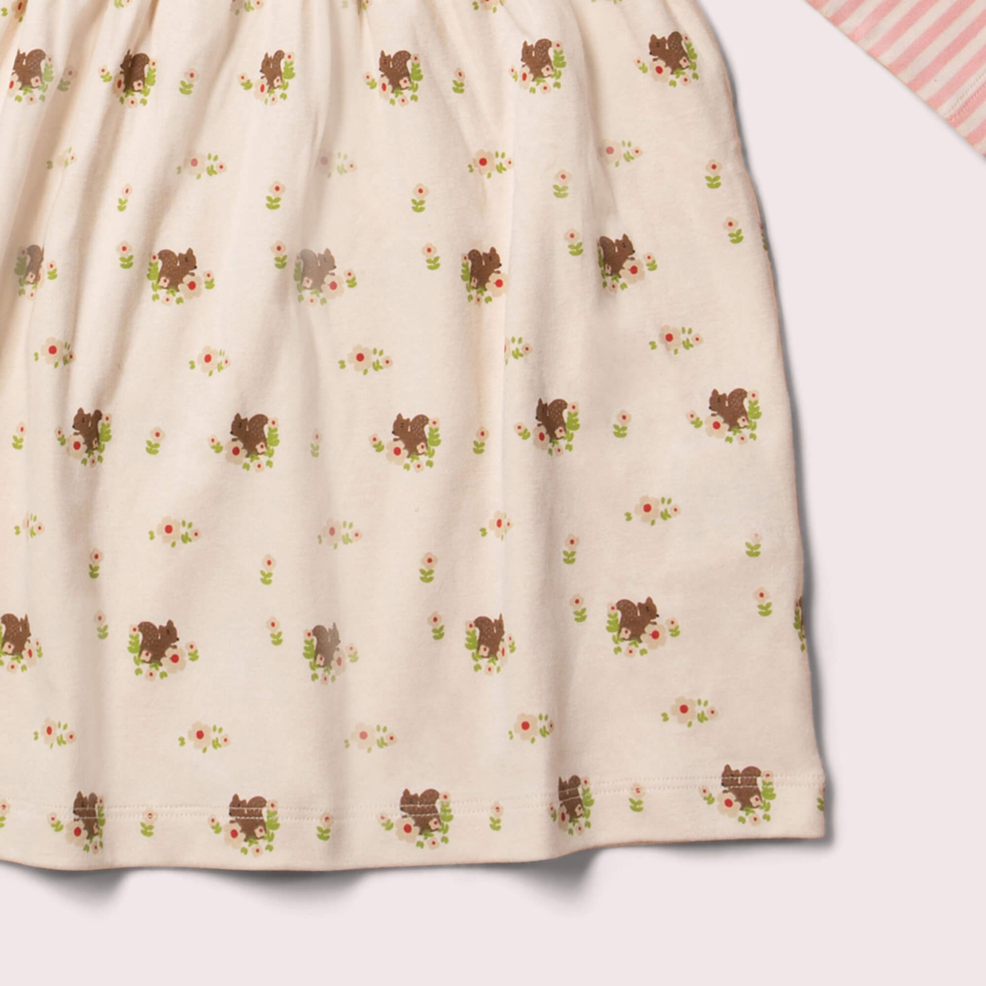- Striped top section with cream squirrel print on the skirt
