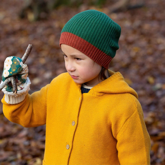 Keep them cosy on cold days with our snuggly knitted organic cotton beanie hat! Pair with a matching scarf for a lovely set or gift.