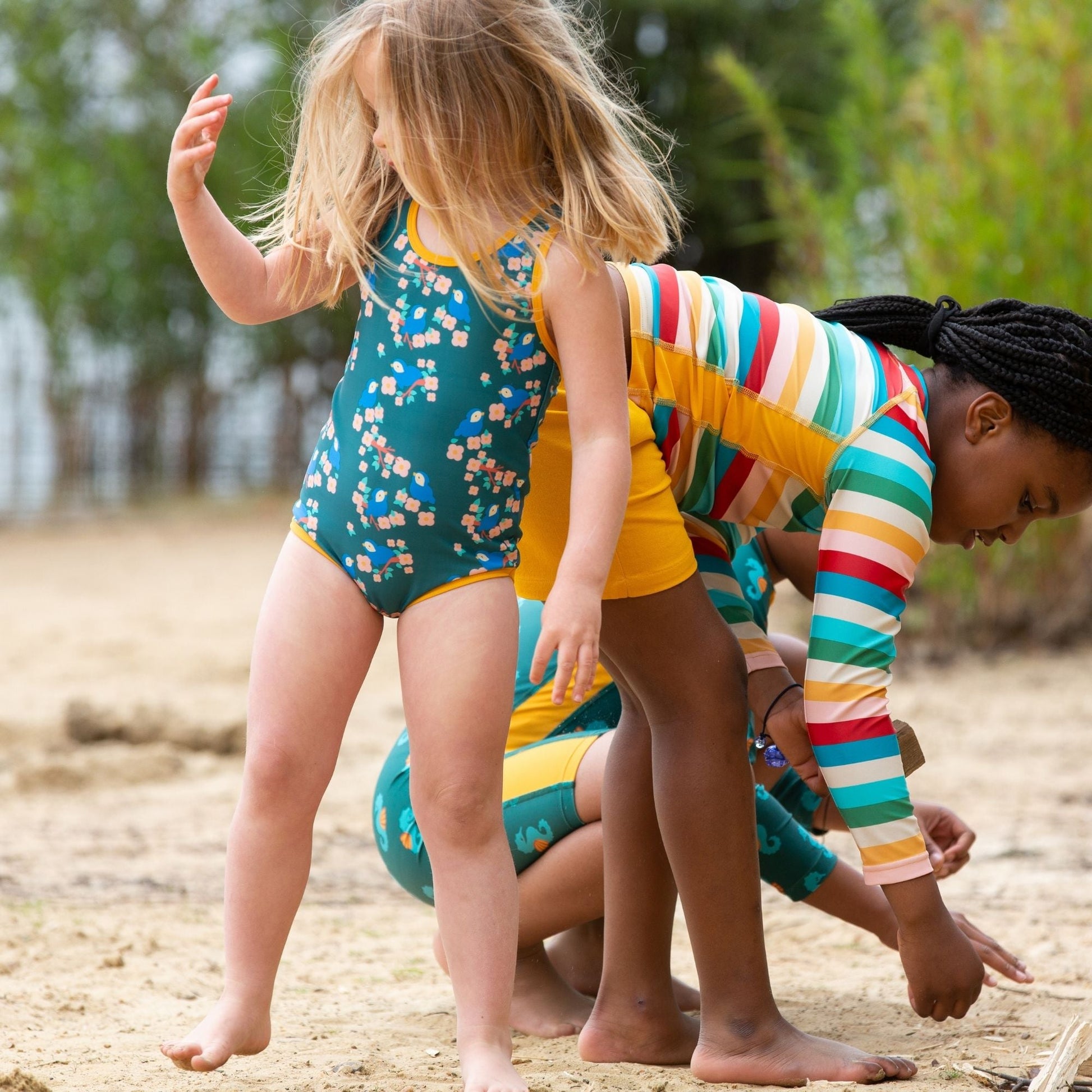 Splash into summer with our new swimwear collection made from recycled materials! This one piece swimming costume is soft and stretchy with flat seams for extra comfort, plus has UPF 50+ sun protection to keep them safe in the sunshine. Choose between colourful prints and jump in!