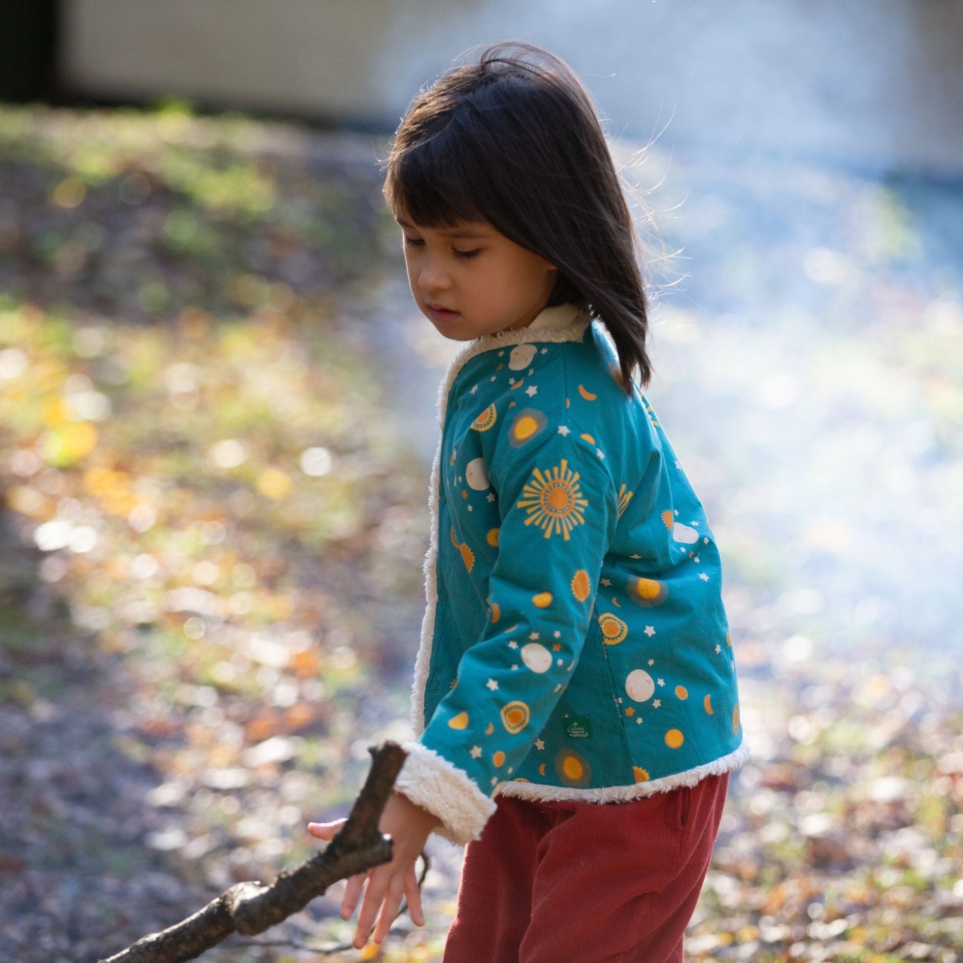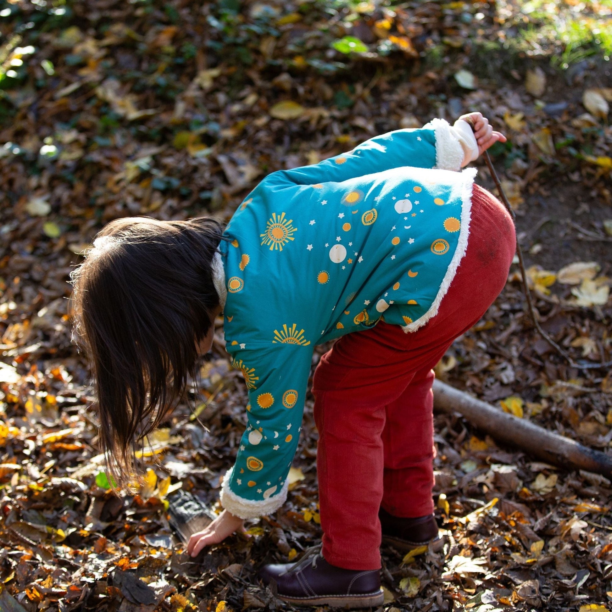 This cosy jacket will keep kids warm when they're out adventuring on cold and windy days. It's reversible (2 styles in 1!) and comes with soft organic sherpa fleece on one side and a colourful print on the other. It's also soft enough to wear as an extra layer indoors to stay extra snug. Wear with cord dungarees, trousers or dresses for a comfy winter outfit.