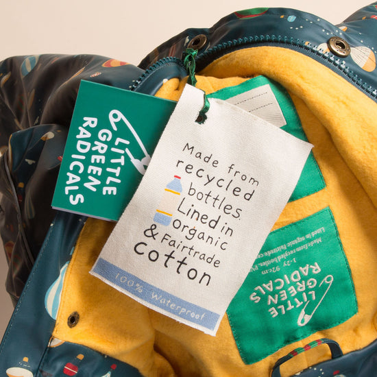 Designed to protect little adventures from the elements, our recycled raincoat's are made using a fully waterproof special performance fabric that's been constructed using plastic bottles! They have a waterproof rating of 5,000mm which means this coat will stay watertight even under very high pressure, making it perfect for heavy rain and wet snow. Our raincoats also have a soft organic and Fairtrade cotton lining, so little ones will stay nice and snug on cooler days.