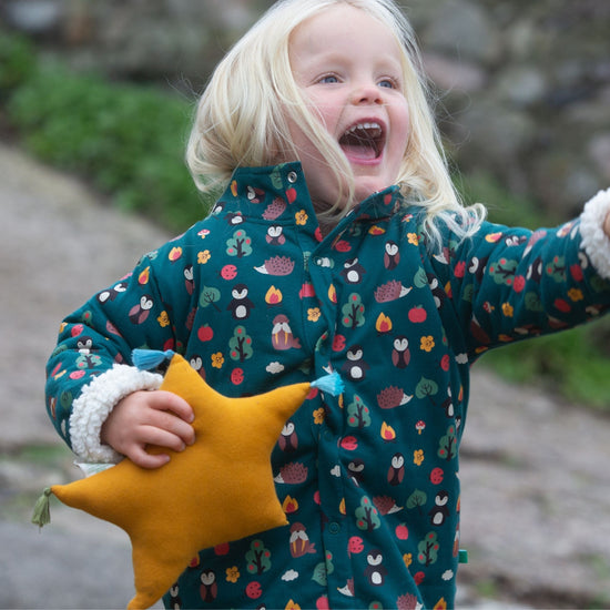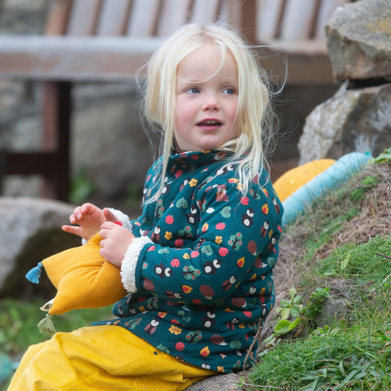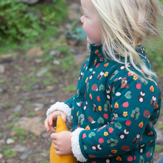 This cosy jacket will keep kids warm when they're out adventuring on cold and windy days. It's reversible (2 styles in 1!) and comes with soft organic sherpa fleece on one side and a colourful print on the other. It's also soft enough to wear as an extra layer indoors to stay extra snug. Wear with cord dungarees, trousers or dresses for a comfy winter outfit.