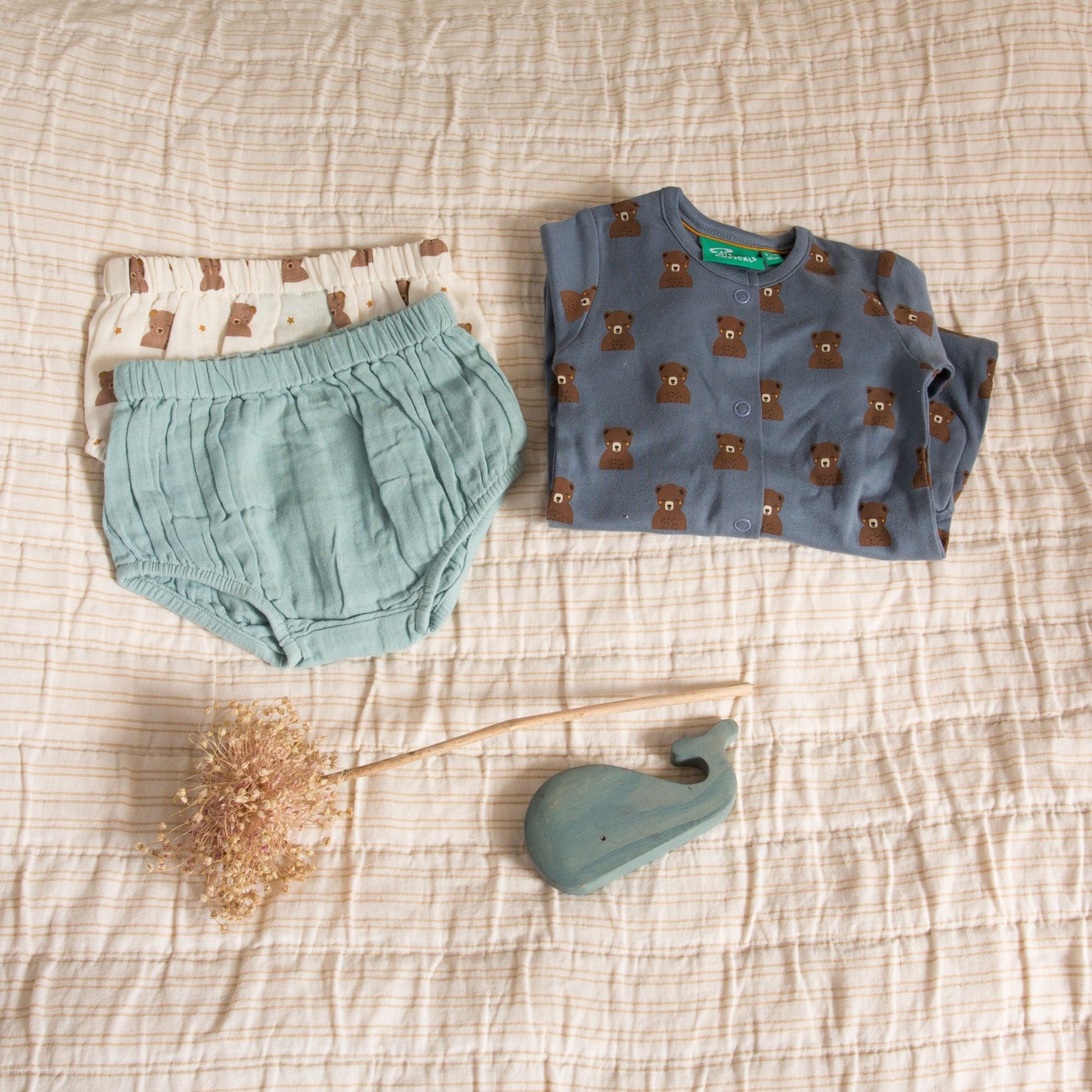 Beautiful bloomers! This lovely style can be worn over a nappy, under dresses or with tees and tops on hot summer days. They come in a loose fit in luxuriously soft organic muslin, so they're really comfy for little ones to explore and play in.