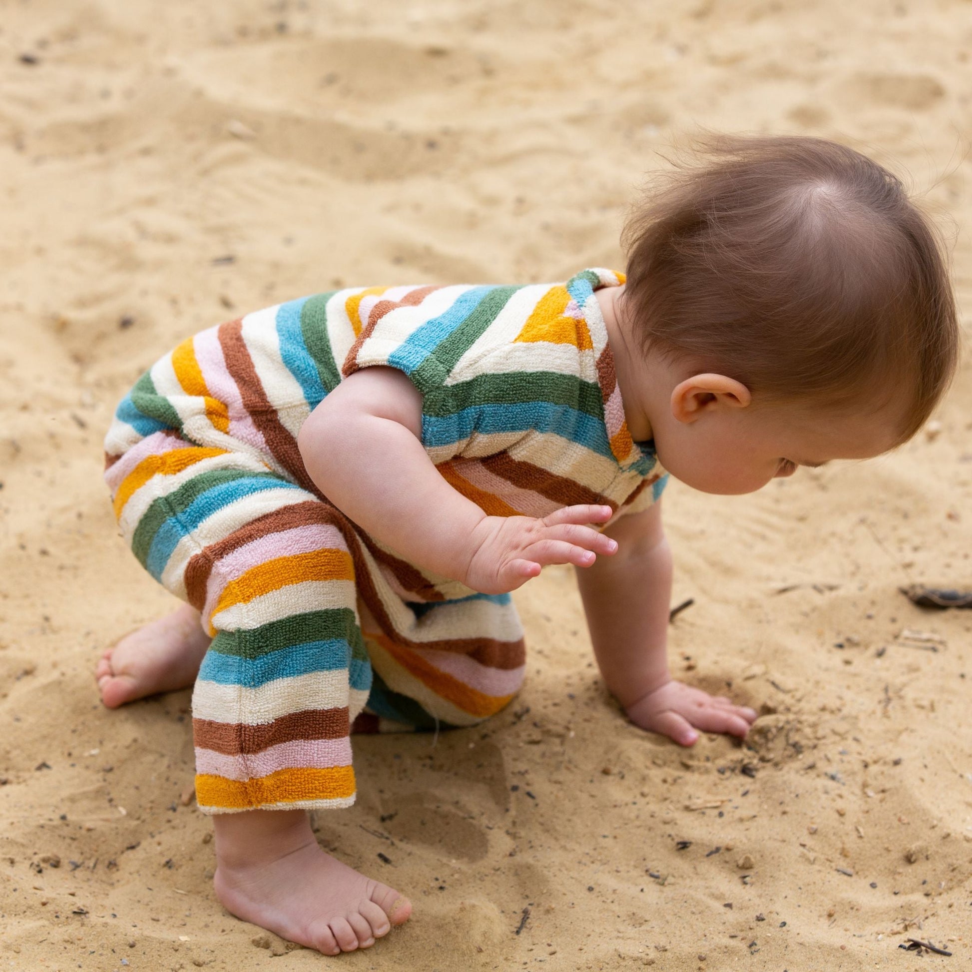 More about our Rainbow Striped Towelling Romper The perfect summer holiday outfit to keep little ones and comfy, especially on the beach or by the pool. Pop on this soft all-in-one and they're ready t…