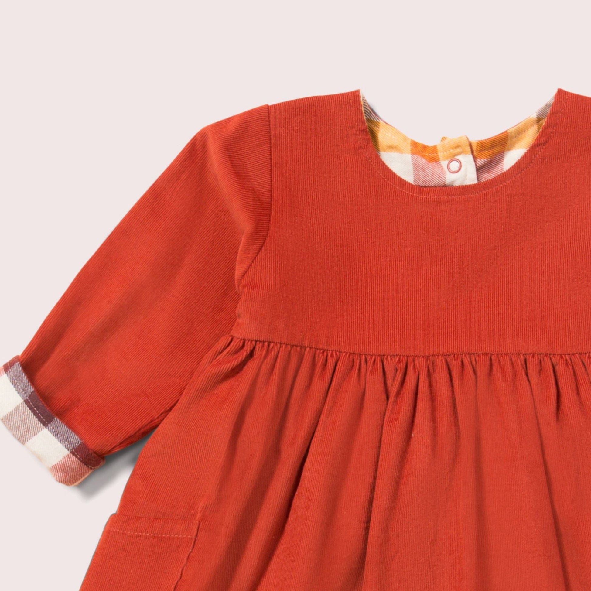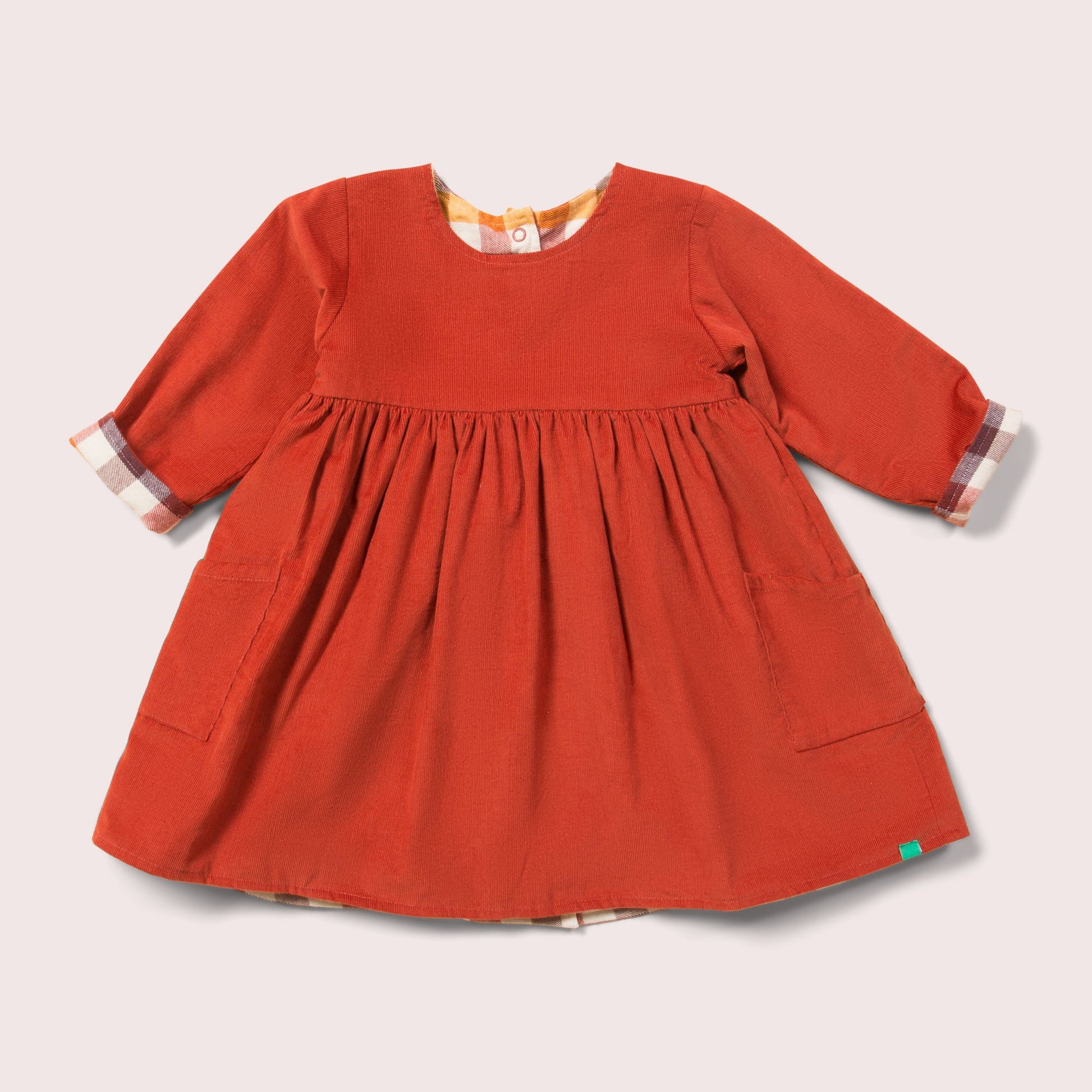 2 styles in 1! This classic dress is reversible so can be worn day after day. It has cosy cord on one side (with little pockets on the front) and soft brushed cotton on the reverse. The double layer makes it lovely and warm, so it's the perfect dress to wear from Autumn all the way to Spring. We've used fantastic quality, long-lasting organic cotton fabric, and timeless a design, so it's a lovely style for everyday wear or special occasions.