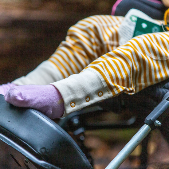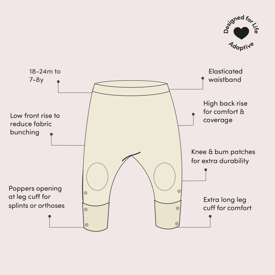 We've developed this range in collaboration with parents of children with disabilities who wanted comfy, adaptive clothing that's also bright, beautiful, functional, and organic! These extra-long joggers are available from 18 months to 8 years old and come with;