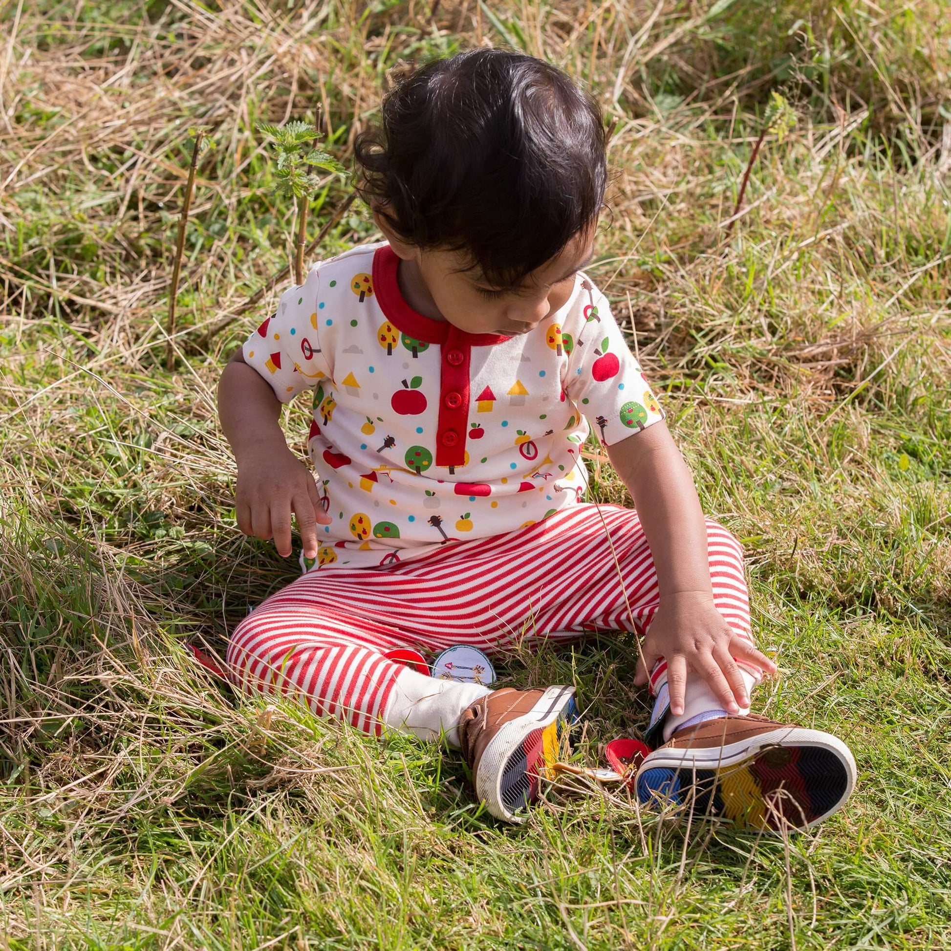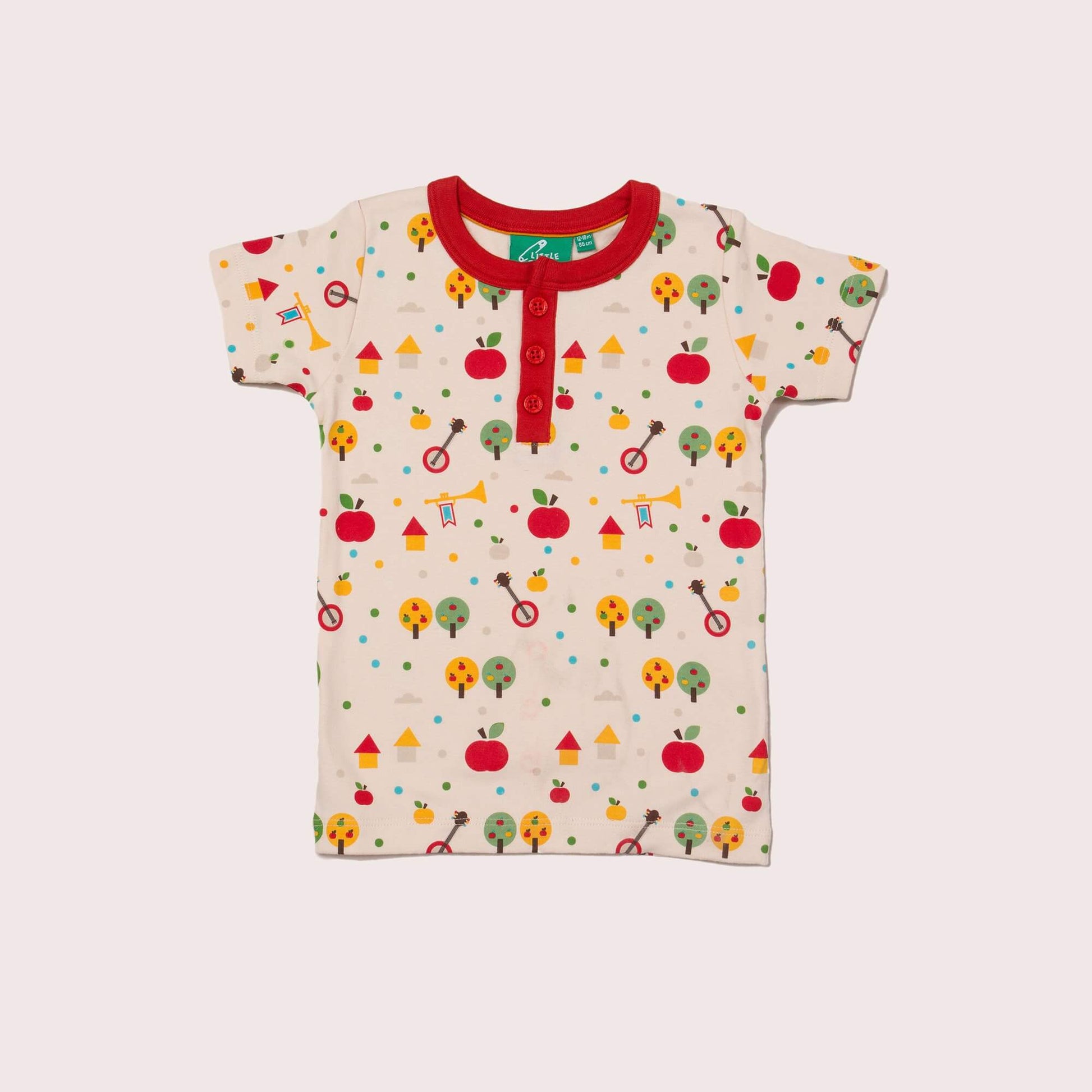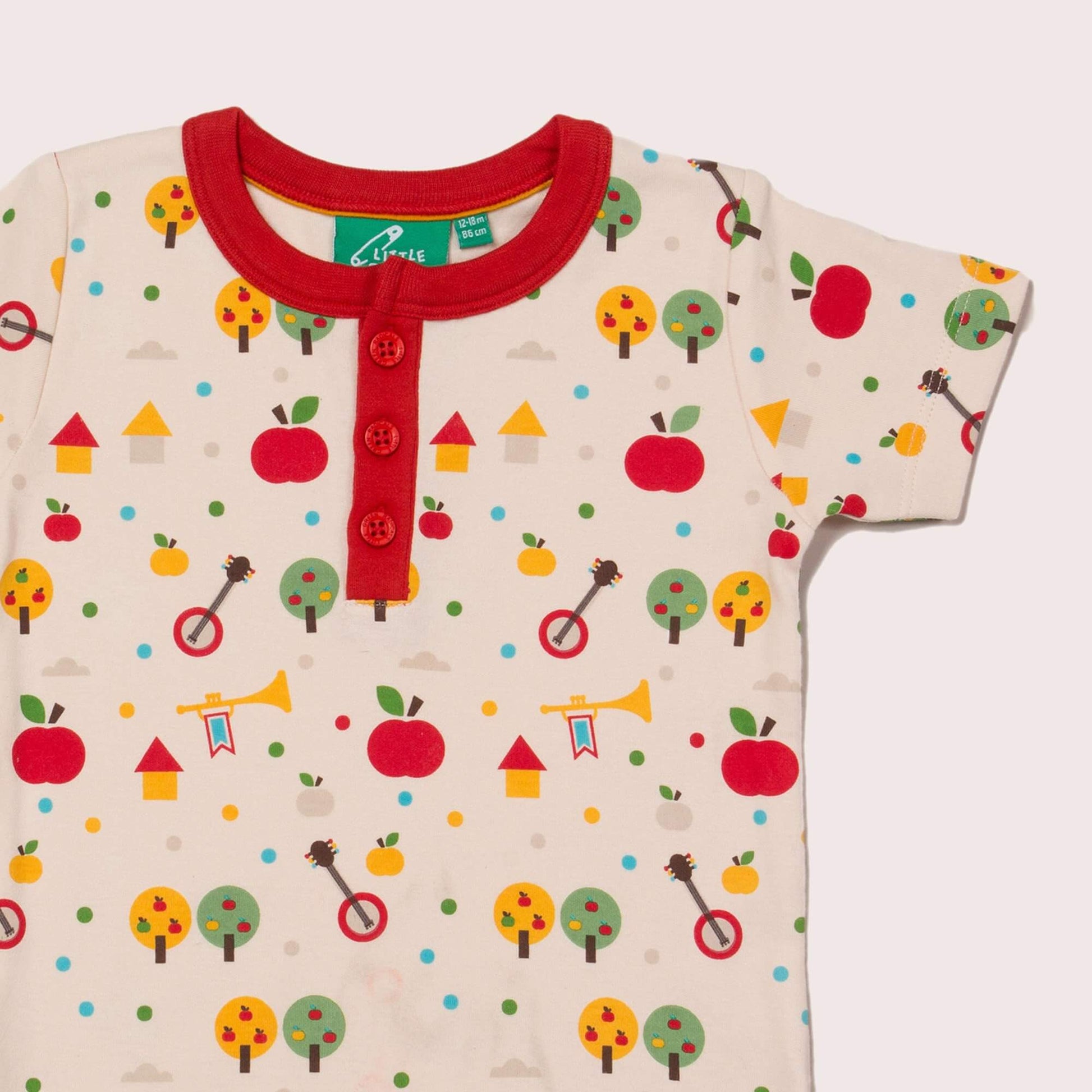 Beautifully soft and comfy to wear, this might just be their new favourite t-shirt! It comes with a button-down front for fuss-free dressing, a colourful apple tree print that both boys and girls will love, and is made from light and breathable organic cotton fabric that will keep them comfy whilst they play. Pair with our joggers for a spring outfit.