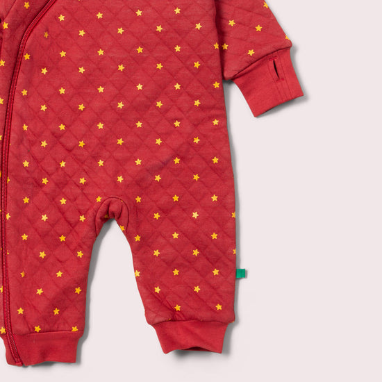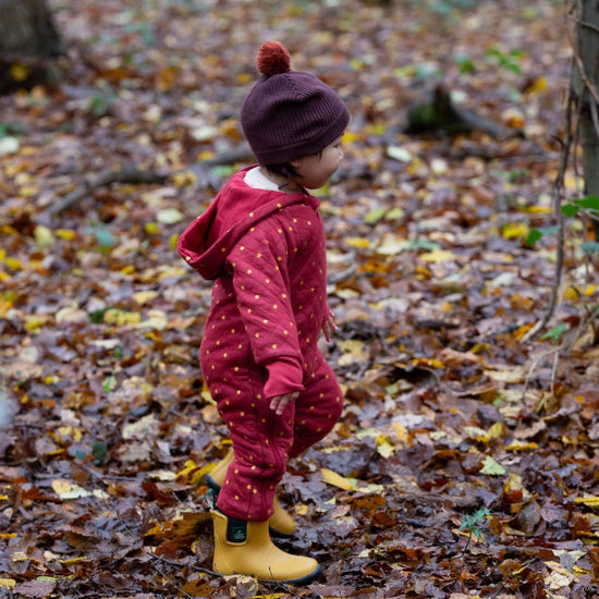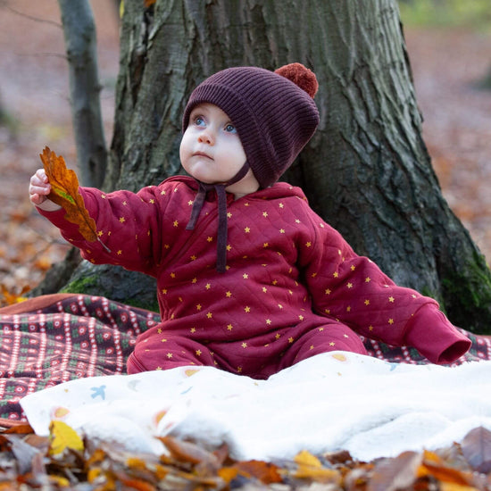 This quilted Snug Suit is made with 100% organic cotton with recycled polyester on the inside so it's both breathable and extra warm, and designed to wear as an all-in-one over clothes to keep them snug as a bug indoor, or out.