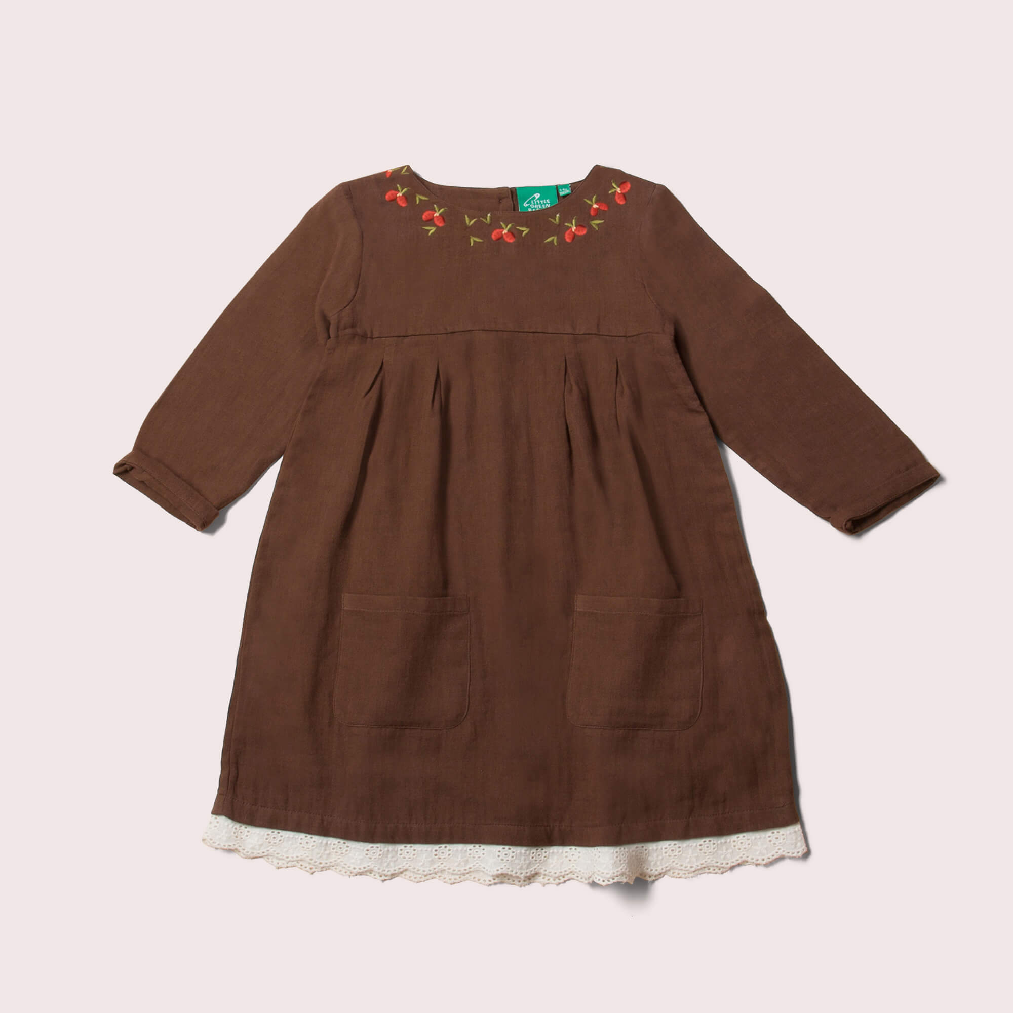 A beautiful style for special occasions, this dress comes with lots of lovely little details including a lace trim around the bottom, two front pockets for their favourite tiny things and a delicate embroidery around the neck. The soft fabric and wide, loose skirt also makes it really comfy for everyday play. Pair with leggings for a cosy outfit.