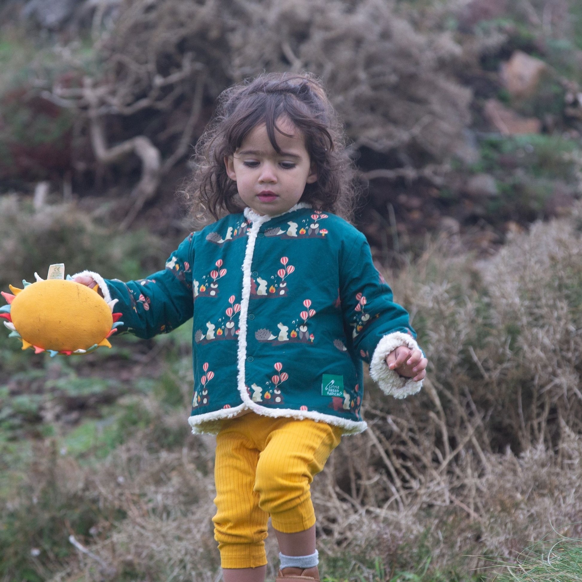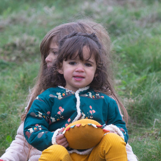 This cosy jacket will keep kids warm when they're out adventuring on cold and windy days. It's reversible (2 styles in 1!) and comes with soft organic sherpa fleece on one side and a colourful print on the other. It's also soft enough to wear as an extra layer indoors to stay extra snug. Wear with cord dungarees, trousers or dresses for a comfy winter outfit.