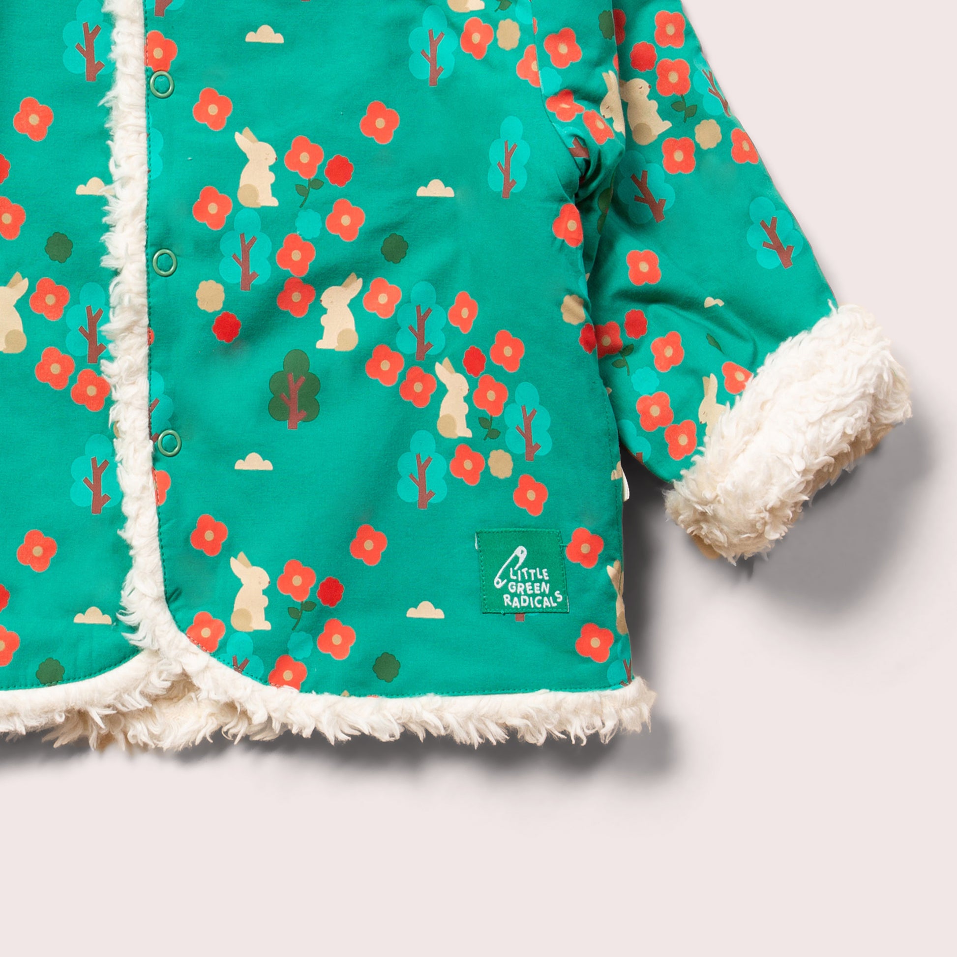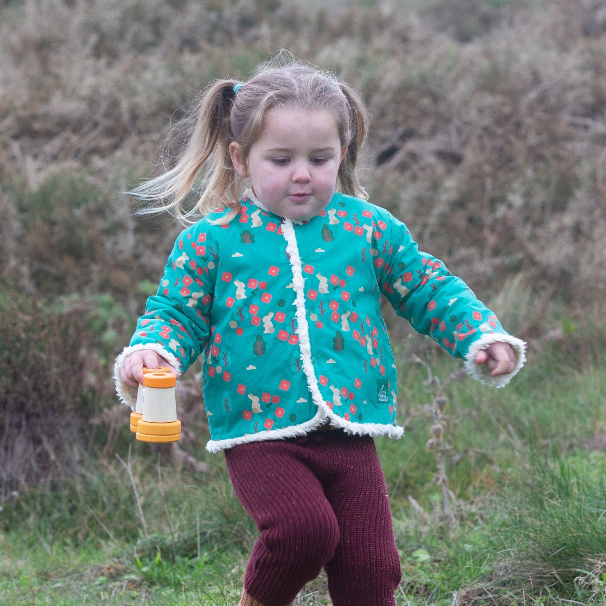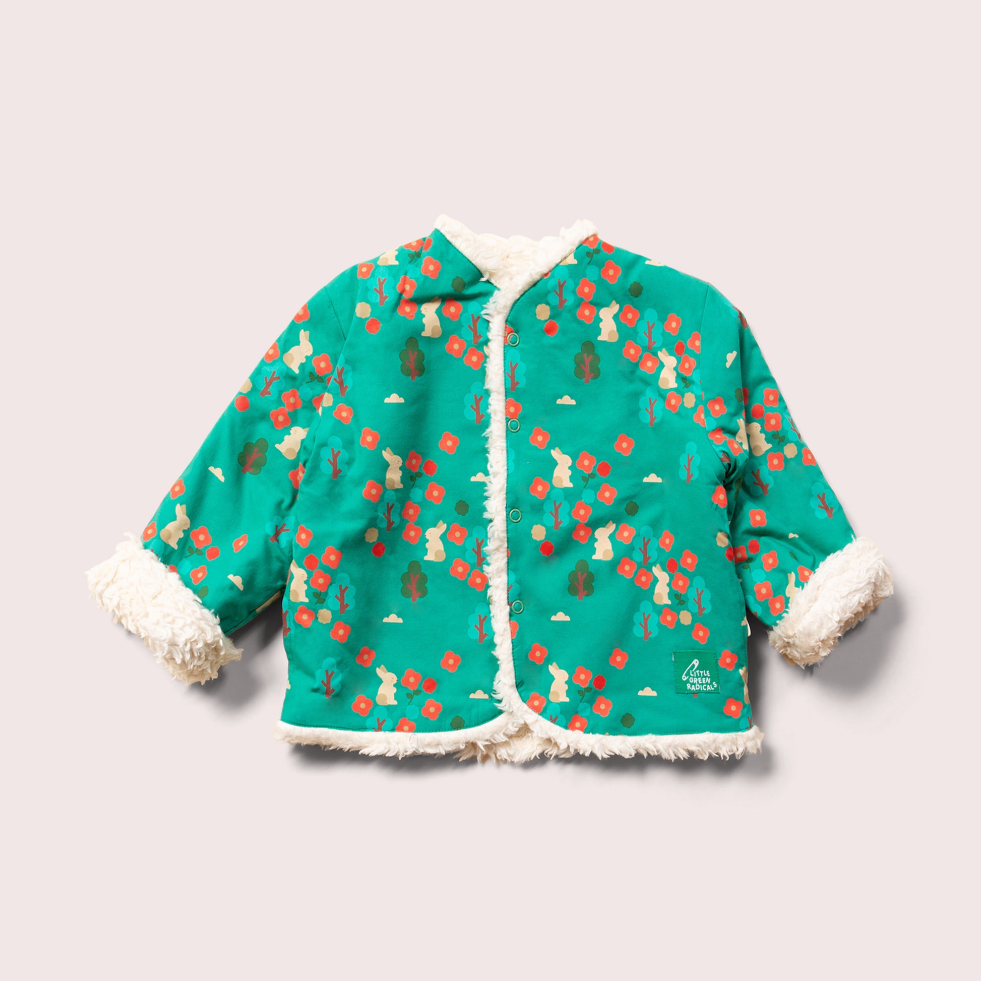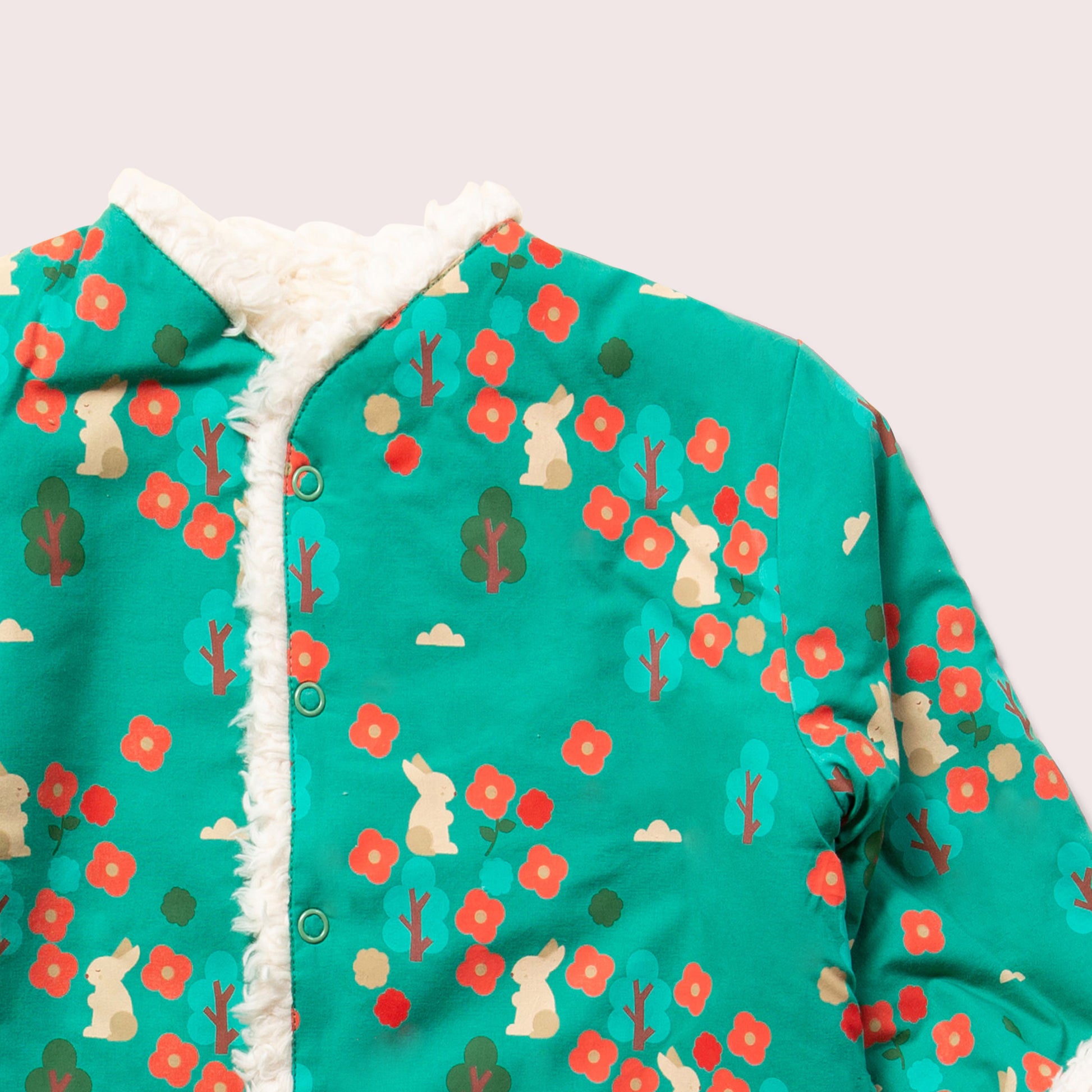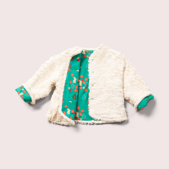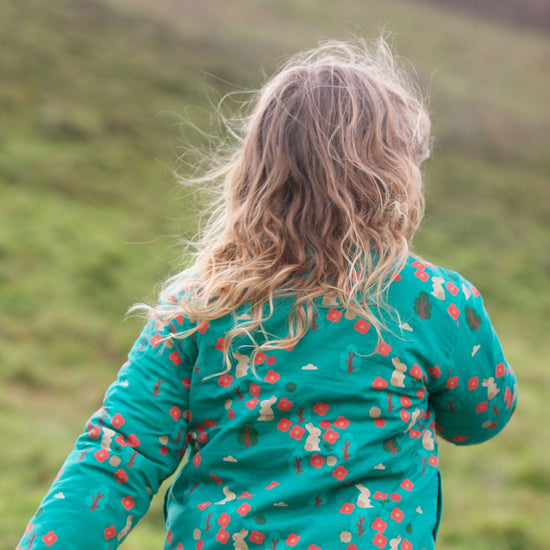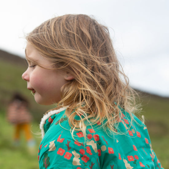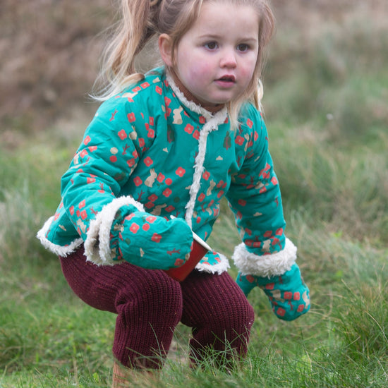 This cosy jacket will keep kids warm when they're out adventuring on cold and windy days. It's reversible (2 styles in 1!) and comes with soft organic sherpa fleece on one side and a colourful print on the other. It's also soft enough to wear as an extra layer indoors to stay extra snug. Wear with cord dungarees, trousers or dresses for a comfy winter outfit.