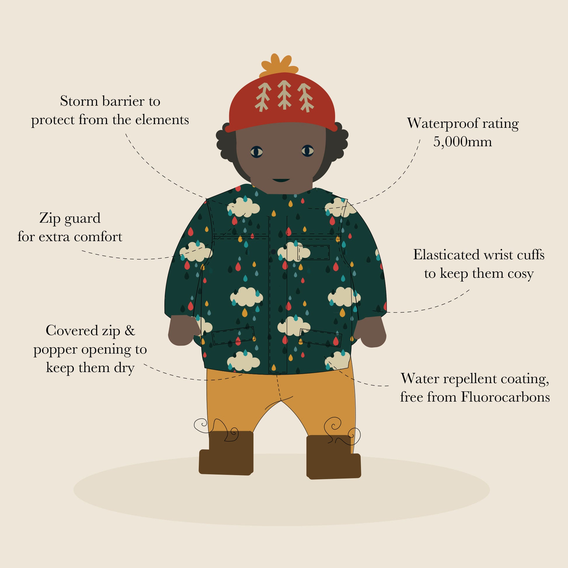 - Water repellent coating which keeps your child extra dry (PFC free)