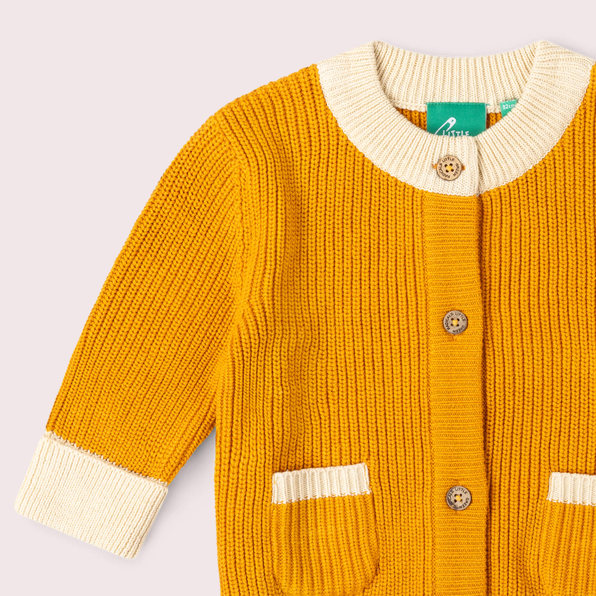 Designed for life. This snuggly cardigan is inspired by traditional handmade knitwear, made to be passed along from one child to another. It comes in a cosy, chunky organic cotton knit with a comfy, loose fit to keep little ones nice and snuggly.