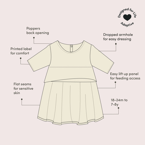 More about our Quince Flowers Adaptive Easy Peasy Dress   This range has been developed in collaboration with parents of children with disabilities who wanted comfy, adaptive clothing that's also brig…