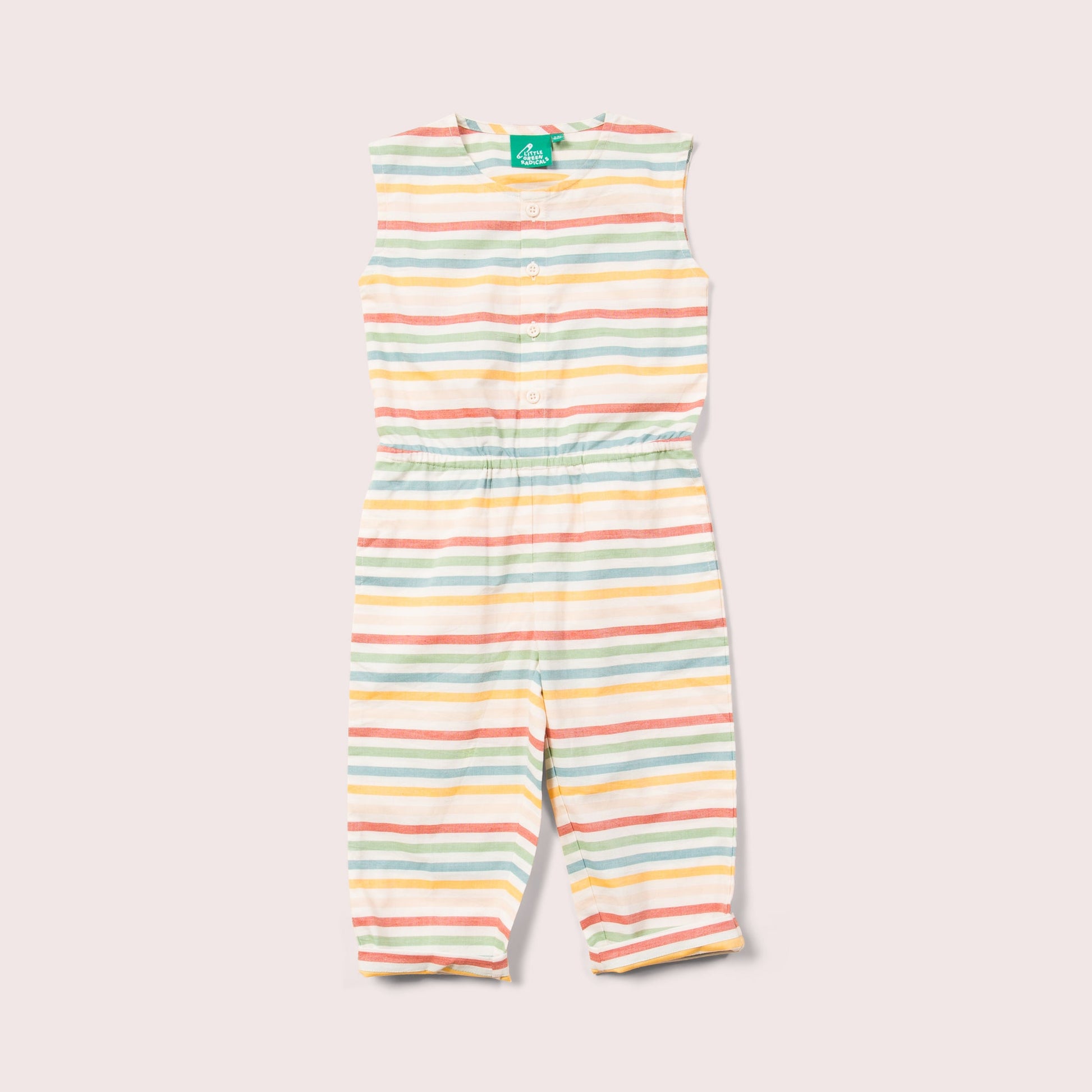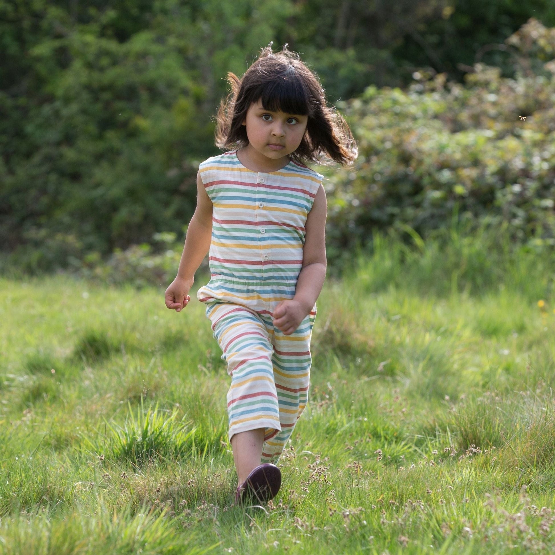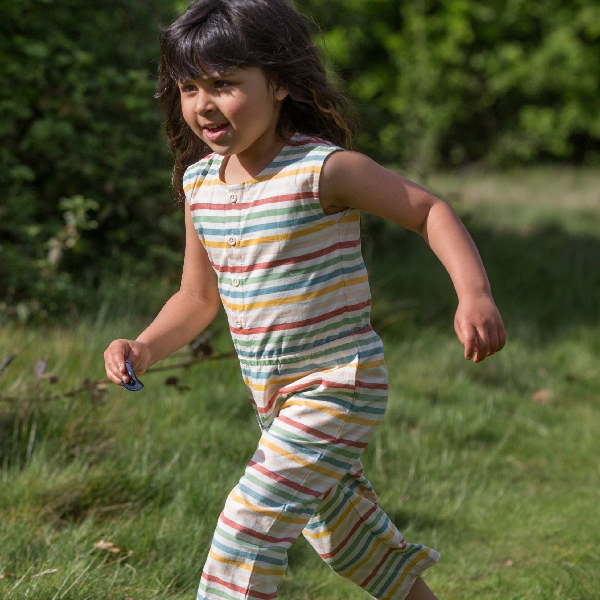 Comfy, all-in-one jumpsuit they'll love to wear! It's cropped just below the knee, and made from a soft, summery organic cotton fabric so it's lovely and cool on hot days. Pair with a sunhat when the sun shines.