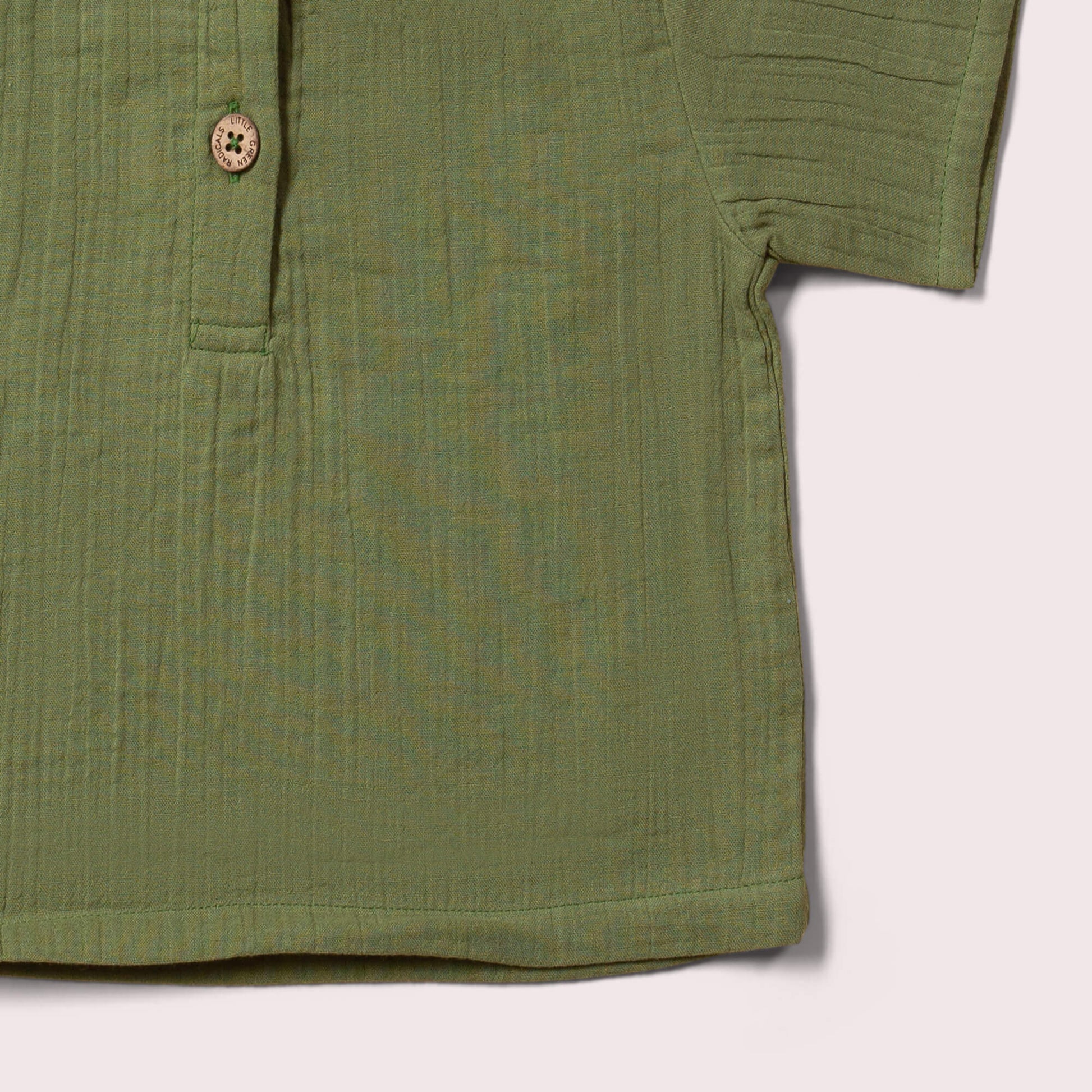 Chive Green Muslin Loose Fit Short Sleeve Henley Top