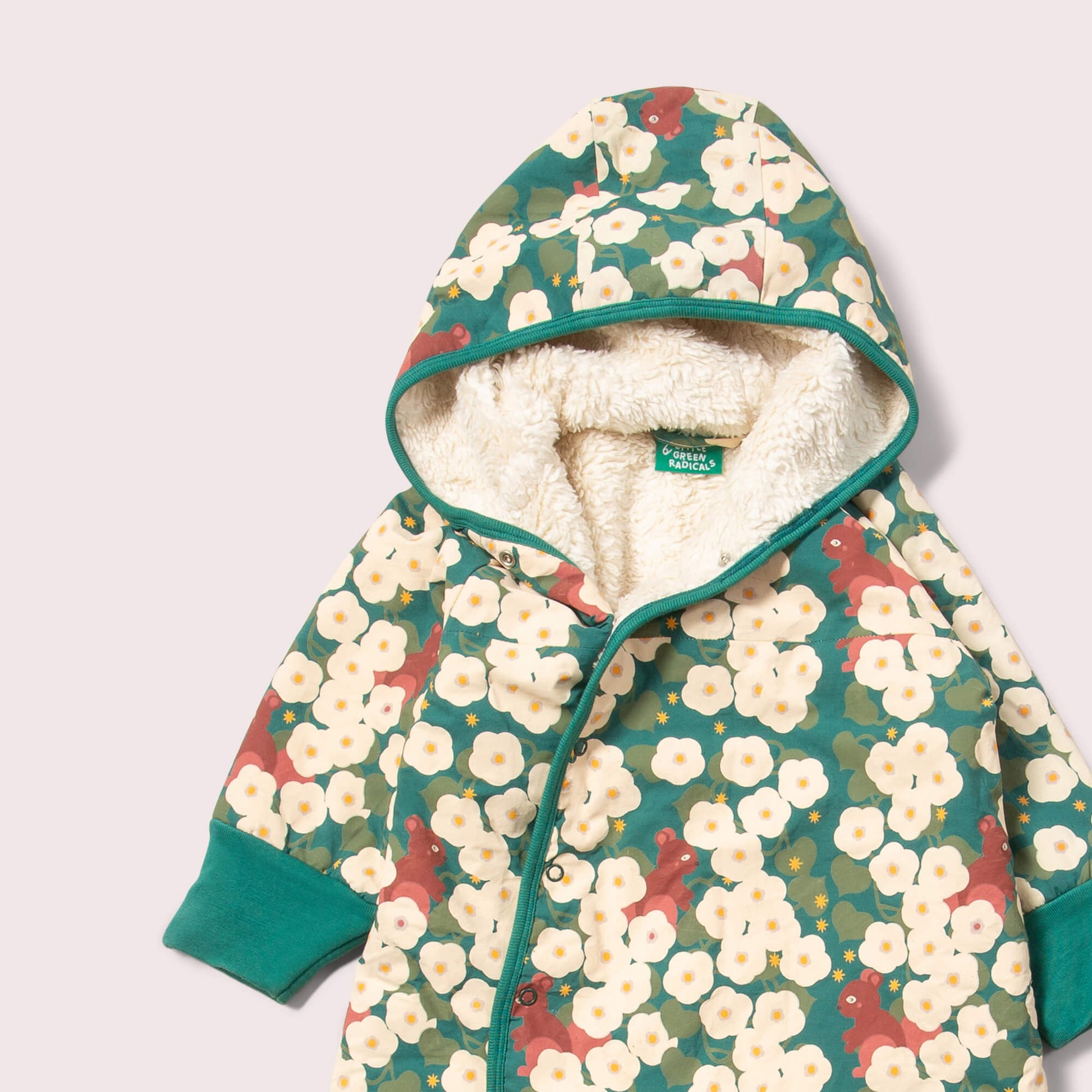Our snuggly Snowsuits are made using a beautifully soft, breathable organic cotton sherpa lining on one side with a patterned, durable poplin layer on the outside. This is a warm and cosy style that can be worn over clothes as a Pram Suit or as an all-in-one for toddlers on the move so they can stay snug whatever their adventure. Pair with our matching winter sherpa accessories for a lovely set.