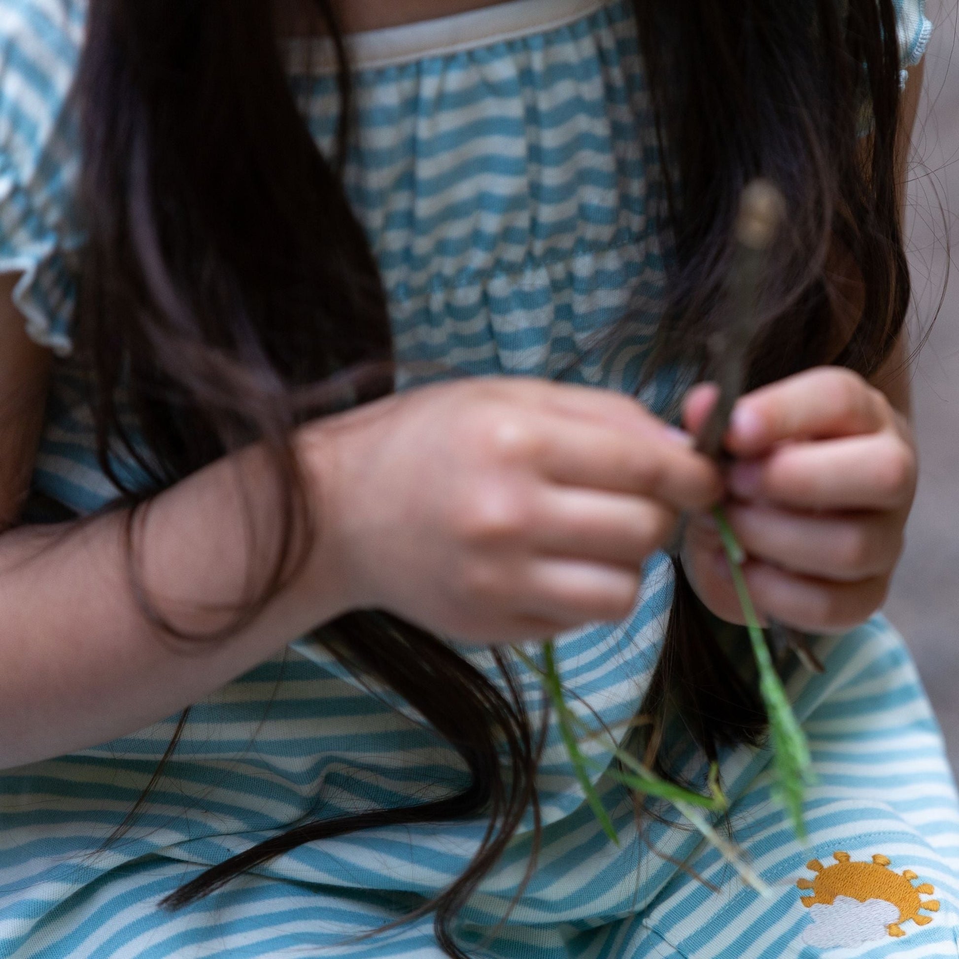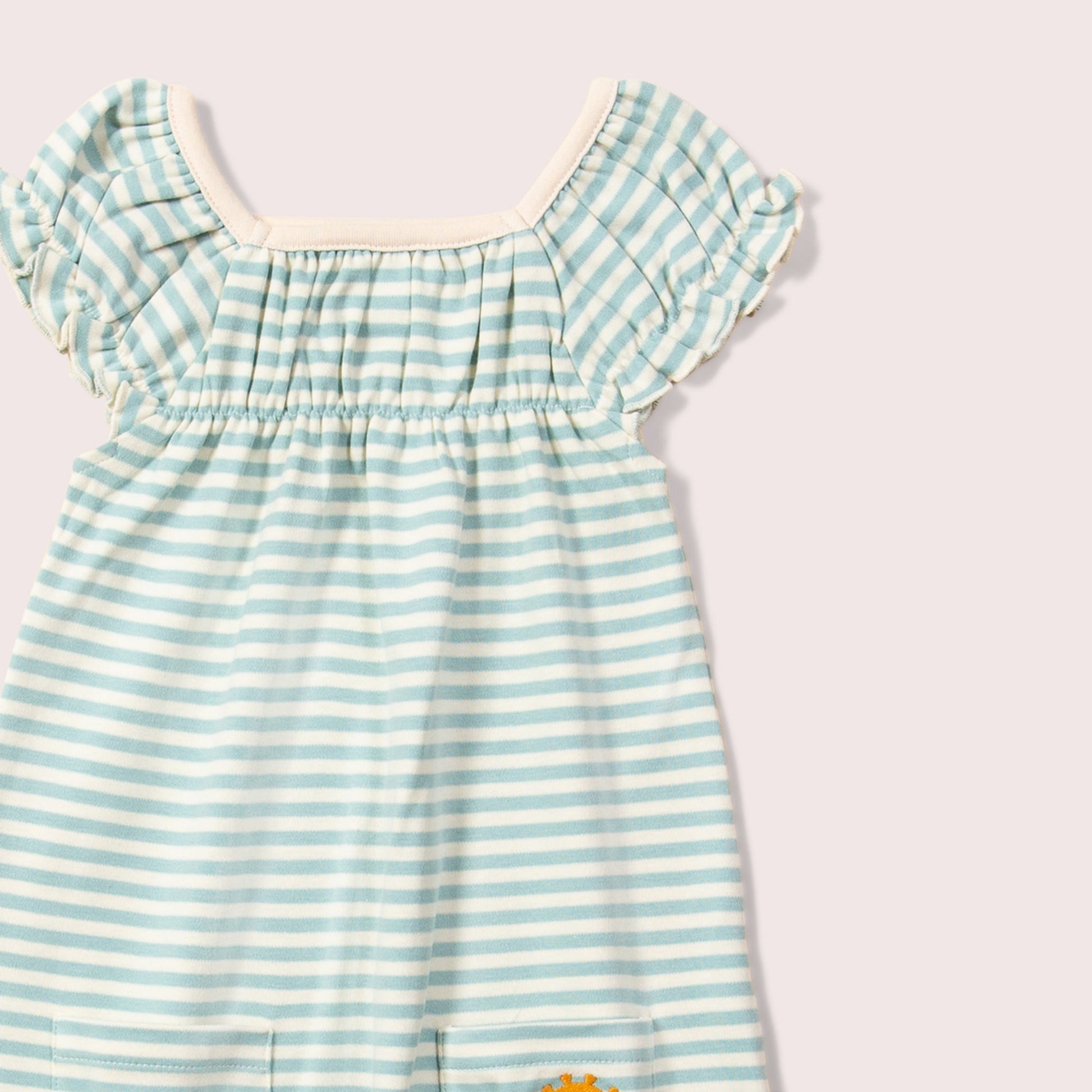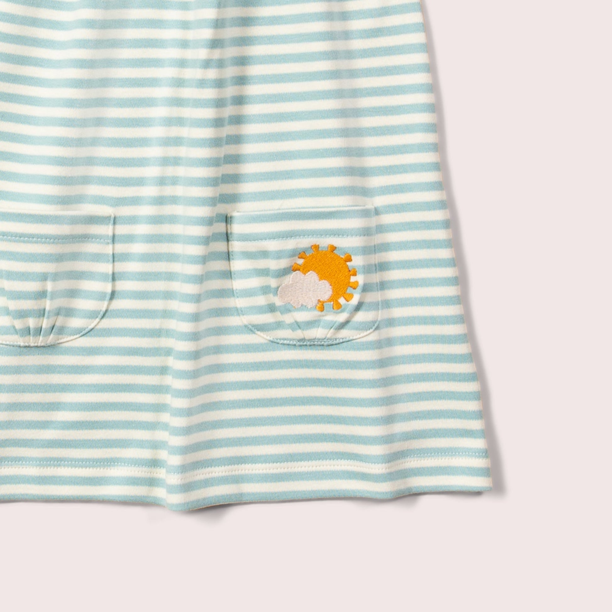 No poppers, no buttons, no zips... no fuss. Just pop on this dress and they're ready to go! It's a really easy to wear summer style, with an elasticated gathered top, frill capped sleeves and a wide skirt with lots of room for movement as they play. It's made from beautifully soft, fantastic quality organic cotton that will keep them comfy all day, and come up like new wash after wash.