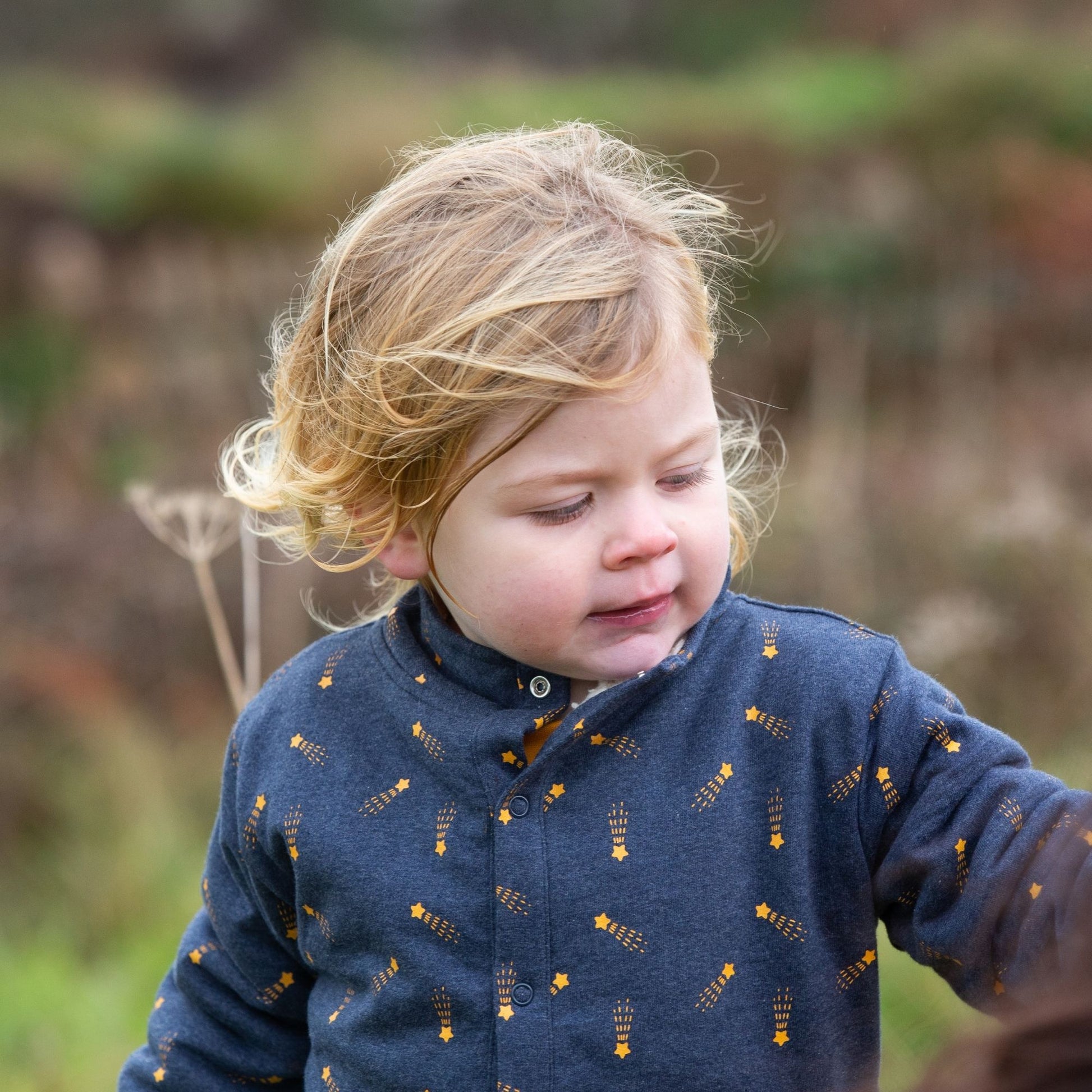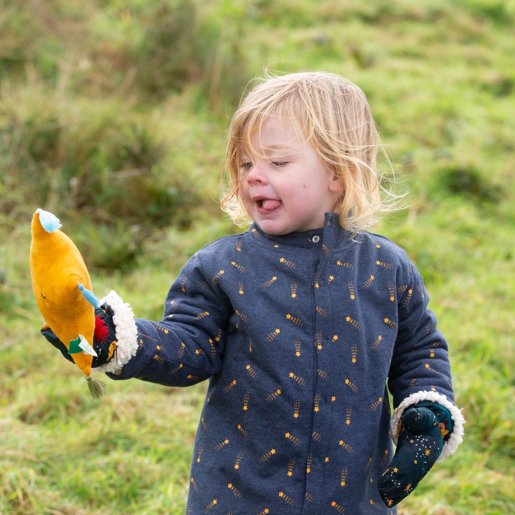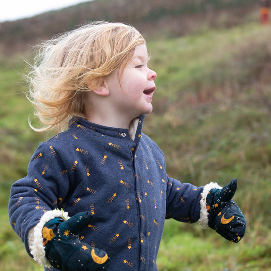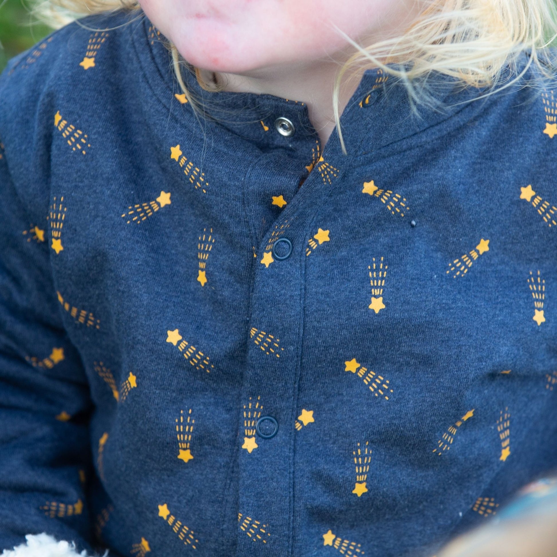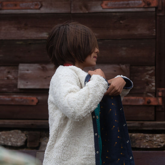 This cosy jacket will keep kids warm when they're out adventuring on cold and windy days. It's reversible (2 styles in 1!) and comes with soft organic sherpa fleece on one side and a colourful print on the other. It's also soft enough to wear as an extra layer indoors to stay extra snug. Wear with cord dungarees, trousers or dresses for a comfy winter outfit.