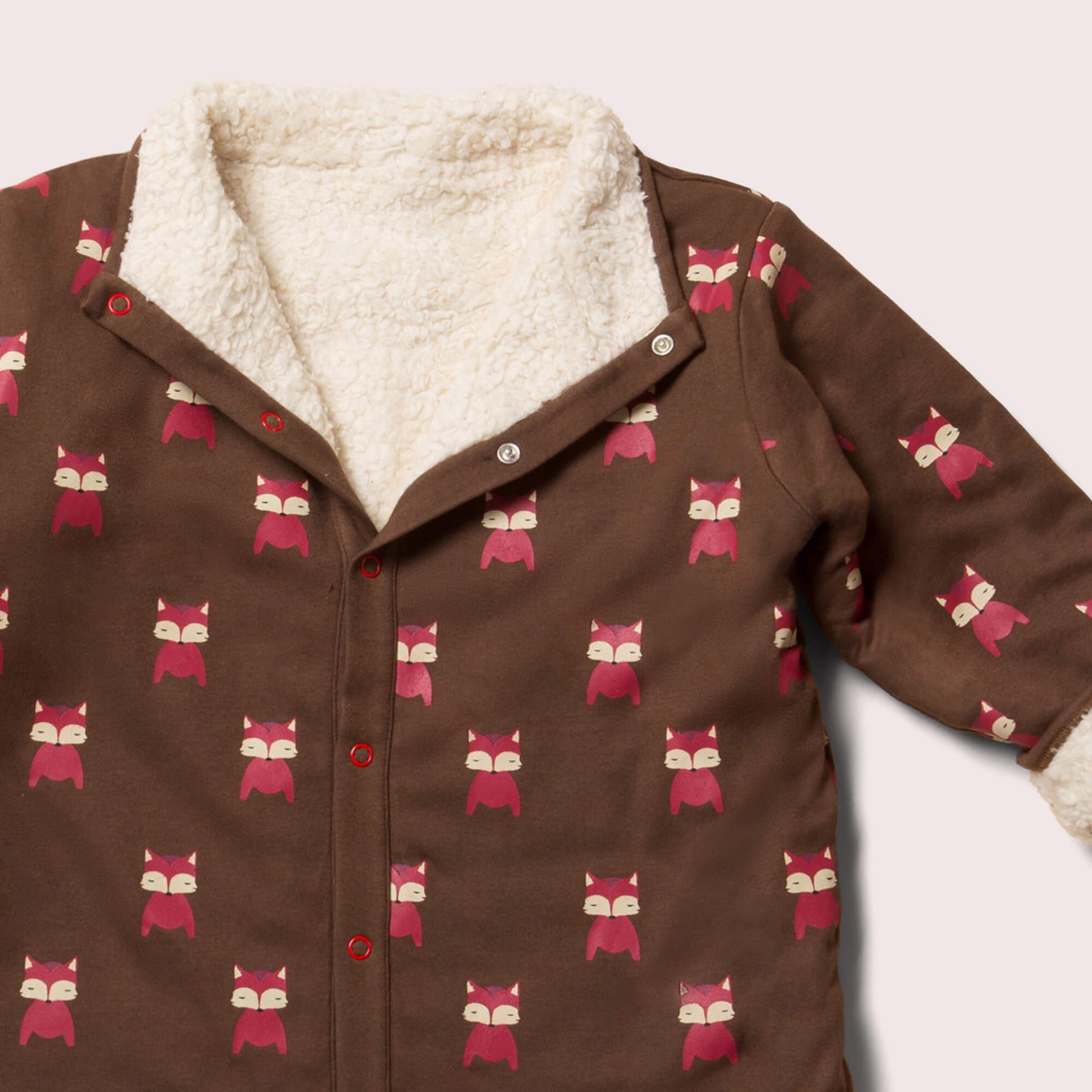 Thissnugglyjacket will keep little ones warm when they're out adventuring on cold and windy days. It's reversible (2 styles in 1!) and comes withsoft organic sherpa fleece on one side and a colourful print on the other. Wear withcosytrousersfor a comfy outfit.