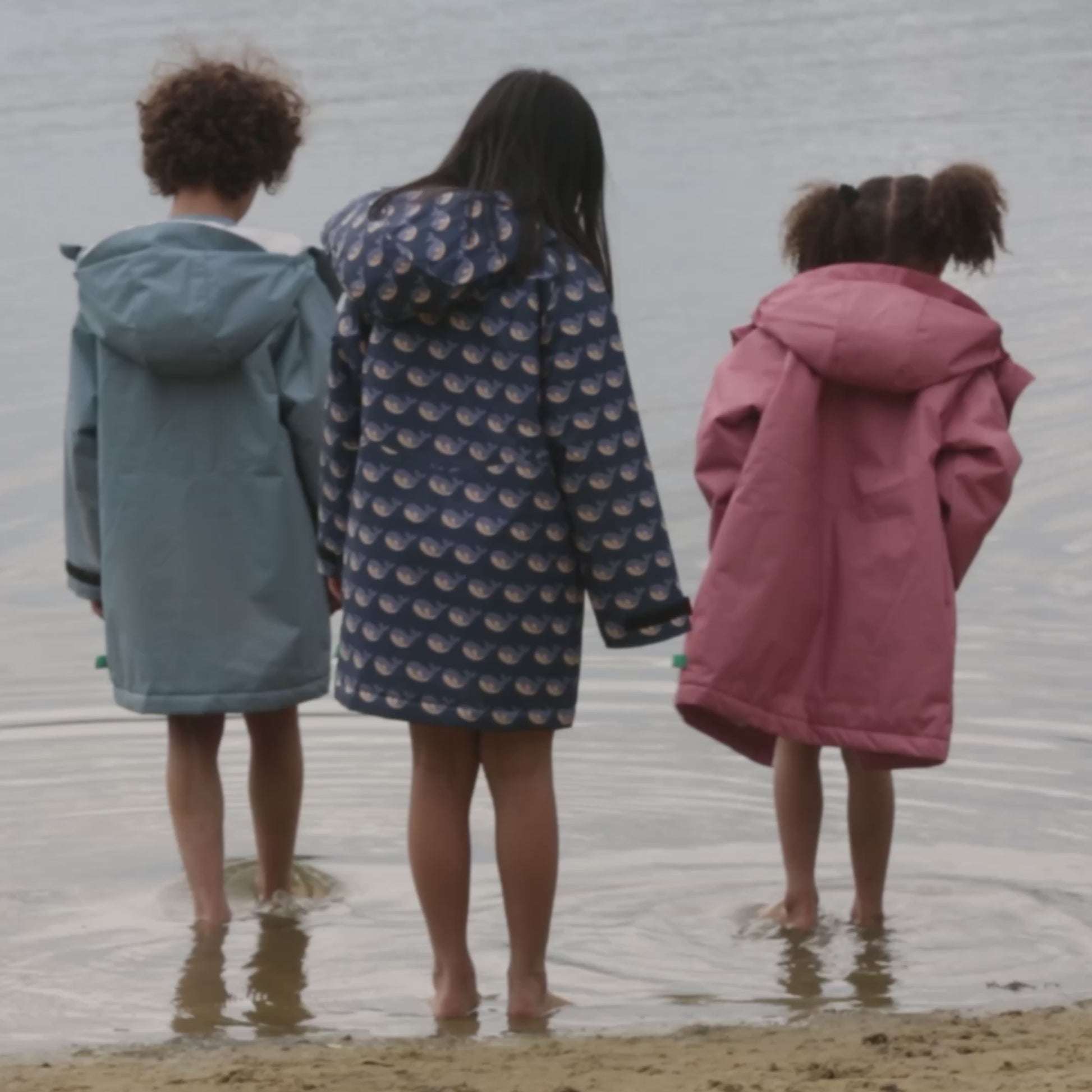 All weather robe to wear everywhere! This is your go-to coat for every adventure, made from recycled materials, fully waterproof, super soft cosy lining, full-length, unisex, sized with room for growth and comes with a 2 way YKK zip for easy changing.