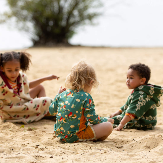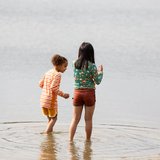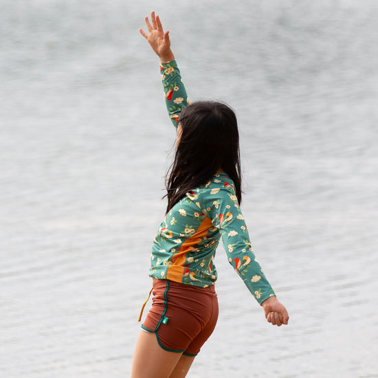 This long sleeved, pull-on recycled rash vest is soft and stretchy with flat seams for extra comfort. Comes with UPF 50+ sun protection to keep kids safe in the sunshine. Pair with a swimsuit, swim shorts or swim nappy and dive in!