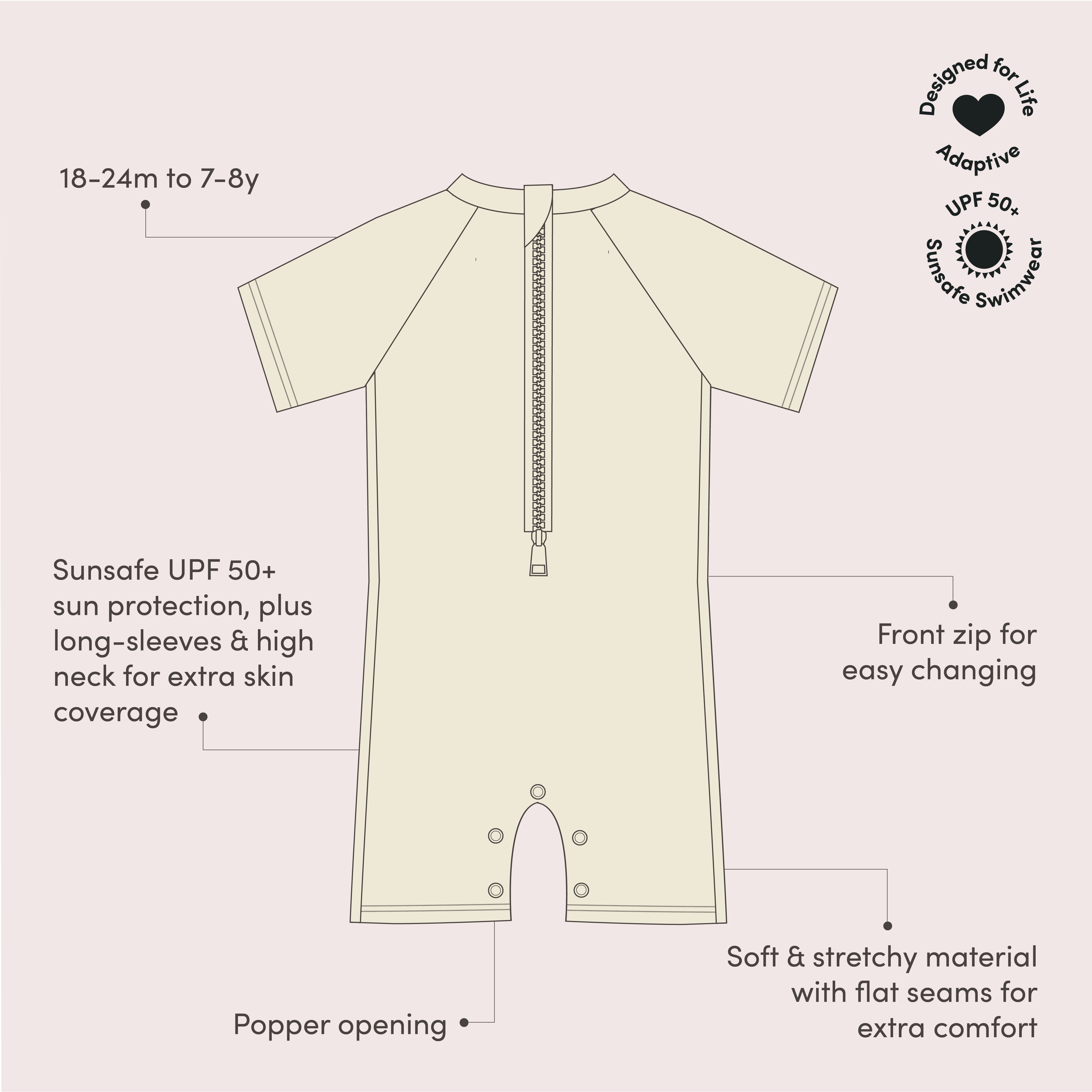 Splash into summer with our swimwear made from recycled materials! This all-in-one sunsafe sunsuit is soft and stretchy with flat seams for extra comfort, plus has UPF 50+ sun protection to keep them safe in the sunshine. For easy dressing, we've added poppers along the legs and a long zip at the back Come and dive in!